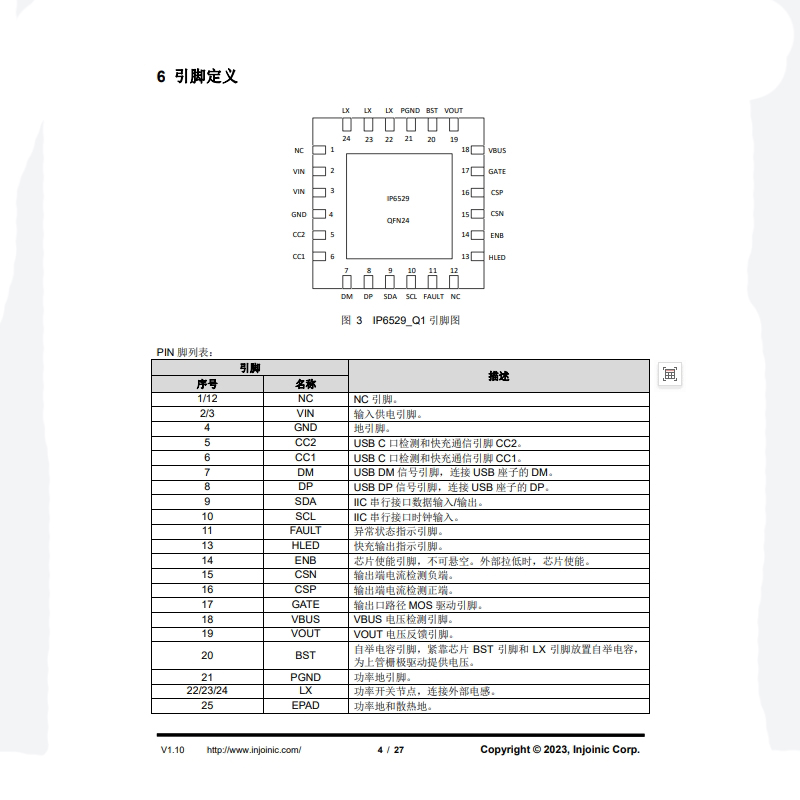 IP6529_Q1采用同步开关降压架构,内置功率MOS管,可减少外部元件数量,简化电路设计。其QFN24(4mm×4mm)封装体积较小,有助于节省PCB空间。同时,较高集成度设计有助于降低BOM成本。此外,芯片支持I²C接口,可与外部MCU通信,实现电压、电流、PDO等参数的读取与配置,为充电管理提供便利。