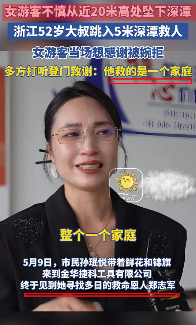 孙女士拿着一面锦旗当面感谢恩人。孙女士接受媒体的采访,她回忆时落水的一瞬间,她眼里含着泪水说:“他救的不是我一个人的命,而是一整个家庭,让孩子有妈妈。”