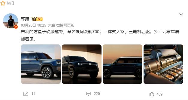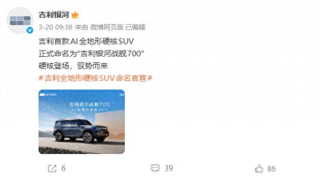 而在家用硬派SUV赛道竞争热度持续攀升的背景下,其他厂商想要从中分的一杯羹只有跟进这一种方法,所以根据网传消息可以得知,同为国产大厂的吉利汽车,也终于带来了自己的重磅硬派家用SUV,于近日正式官宣,旗下首款AI全地形硬核SUV定名为吉利银河战舰700,而新车量产版有望在后续的北京车展完成全球首发,并于年内正式上市。
