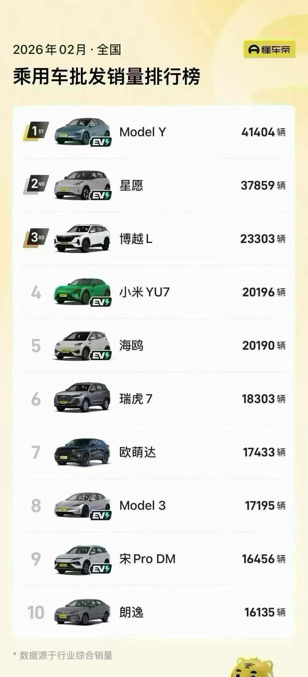 特斯拉Model Y以41404辆的成绩拿下榜单头名,比第二名多出近4000辆,呈现断崖式领先。国产黑马星愿以37859辆位居第二,直接挤掉比亚迪海鸥的位置。博越L卖出23303辆,排在第3,是榜单前三中唯一的纯燃油车型。