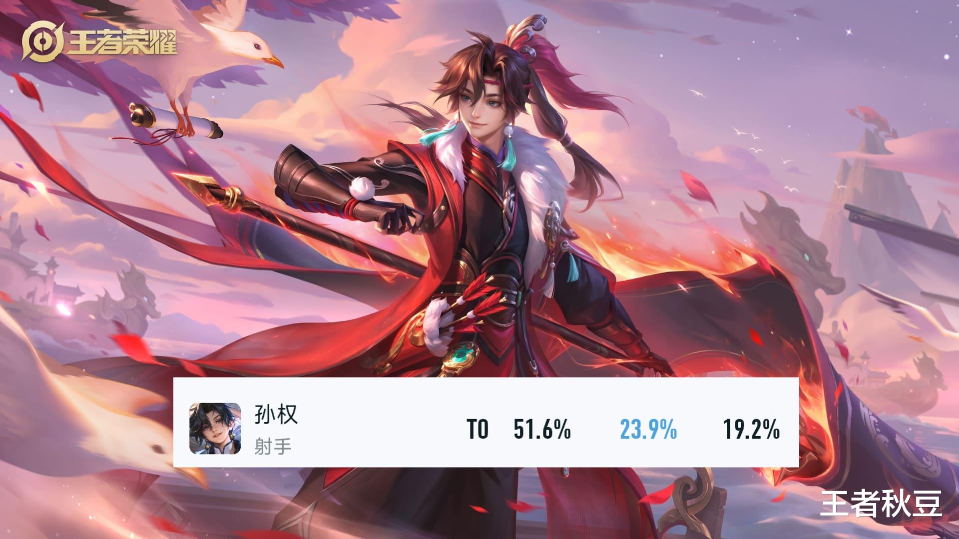 孙权是巅峰赛登场率最高的射手,还是在19.2%的BAN率下的登场率,胜率也有51.6%,属于高手们最喜欢用的射手。孙权的强势崛起一方面是自身强度在线,虽然12级前唯唯诺诺,但是12级和6神装后强度超过伽罗黄忠成为后期最容易翻盘的射手。另一方面就是发育路的普遍弱势,战士型的孙权靠着免伤和半肉出装可以更好的生存打输出。