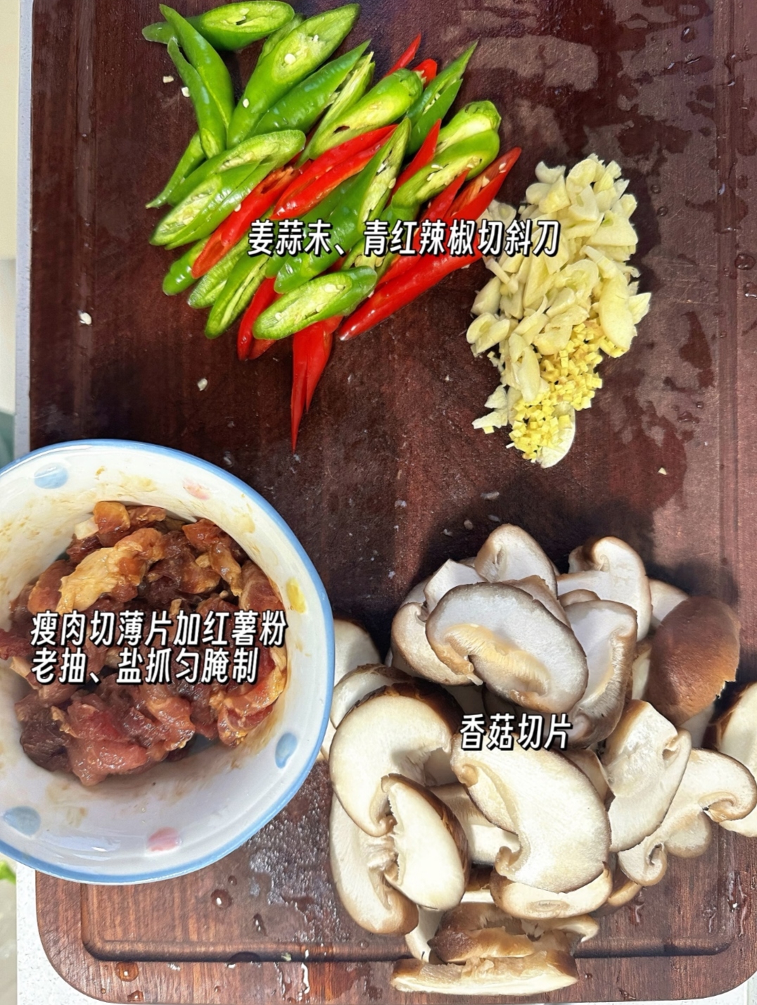 ② 锅里留底油,爆香姜蒜末和青红辣椒圈,火开到最大,倒入香菇片。这时候你会听到"滋啦"一声,这是幸福的开场白!大火快炒是关键,香菇会迅速变软渗出汁水,那个汤汁就是天然的味精。炒到香菇体积缩小一半,边缘微微金黄,大概1分钟。