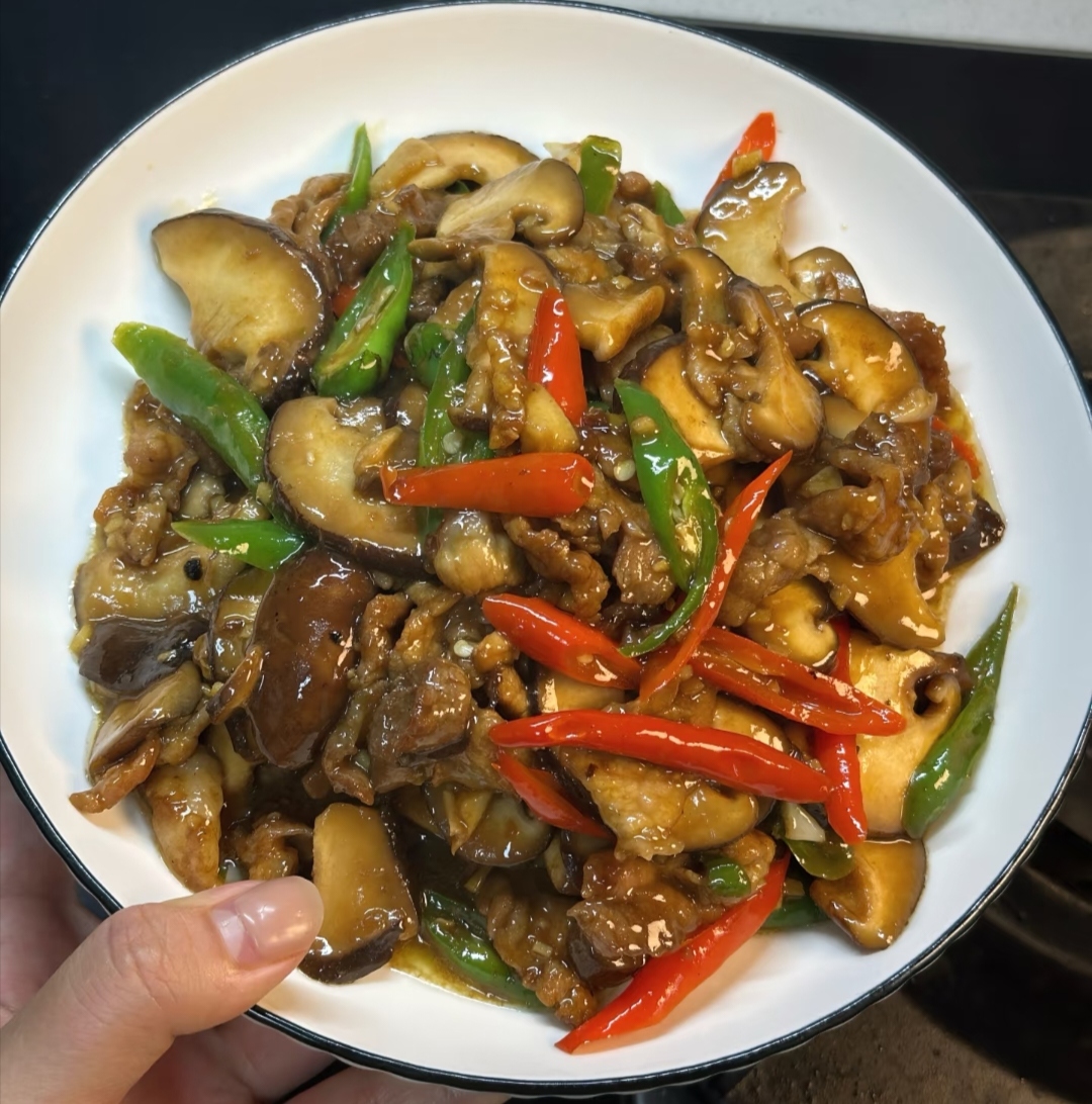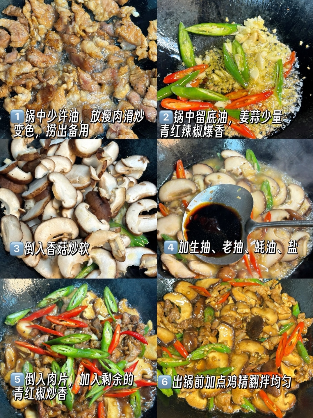③ 倒入调好的酱汁,翻炒均匀让香菇充分上色入味。最后把炒好的肉片回锅,剩下的青红辣椒也一起扔进去,大火快速翻炒15秒,让肉片裹上香菇的汤汁。关火!出锅!整个过程真的3分钟搞定!