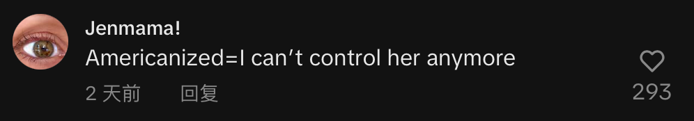 “抱怨美国化=‘在我的文化中,我不能和任何人约会,因为他们无法忍受我的胡说八道,所以我和一个有语言障碍的人约会,当她想离开时,她身边没有家人可以求助’。”