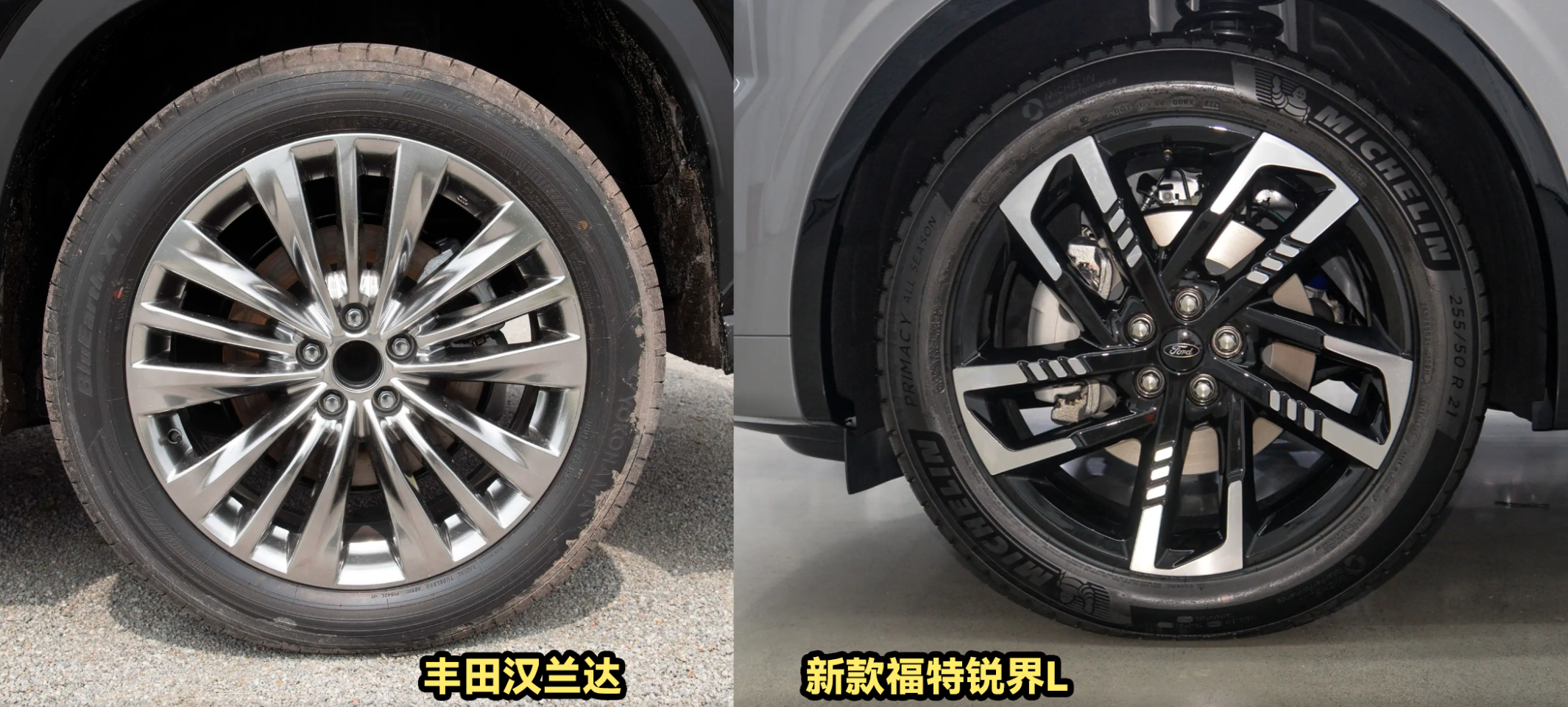 福特锐界L的动力系统就不太一样了,它使用了一台275马力的2.0T EcoBoost®双涡流涡轮增压发动机,而且系统总功率是要高于丰田的,零百加速只有7.1秒的加速时间,汉兰达要8秒多。另外汉兰达为了省油,用的是紧凑型SUV级别的235轮胎,福特锐界L一步到位,直接使用255的大宽胎,又宽又稳。