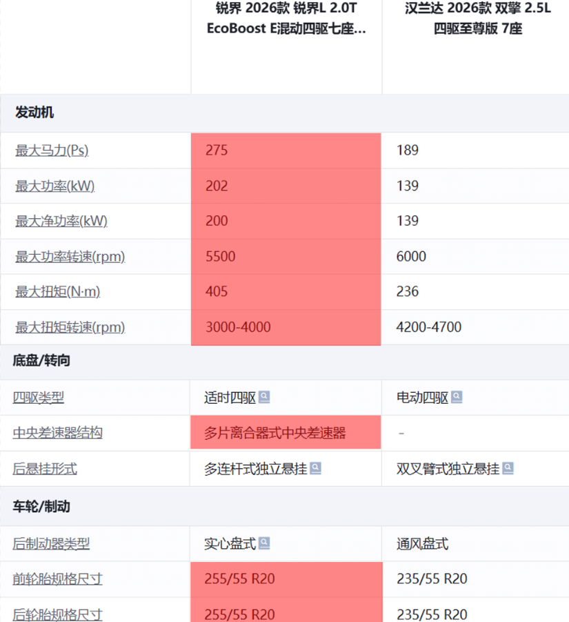 咱们拉一个表格,先说曾经的标杆,汉兰达。汉兰达使用的是丰田的THS油电混动系统,没有什么实质性的越野或者脱困能力,想要诗和远方就不太现实了。而且高转噪声确实有些聒噪,很影响整车的NVH表现。
