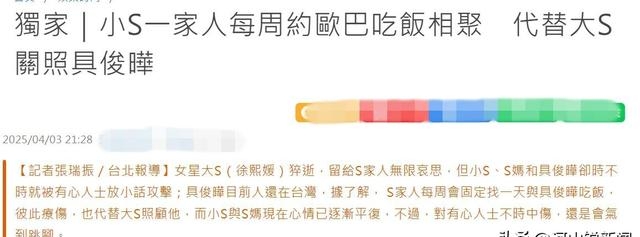 大 S 走了之后,家里那点事儿就没消停过。本来人去世了,大家都该好好悼念,结果前夫汪小菲这边忙着再婚,现任丈夫具俊晔赖在台湾不走,S 妈和小 S 又因为遗产的事儿跟人吵架,你说这事儿闹的,跟菜市场吵架似的,围观的人越来越多,热闹得很。