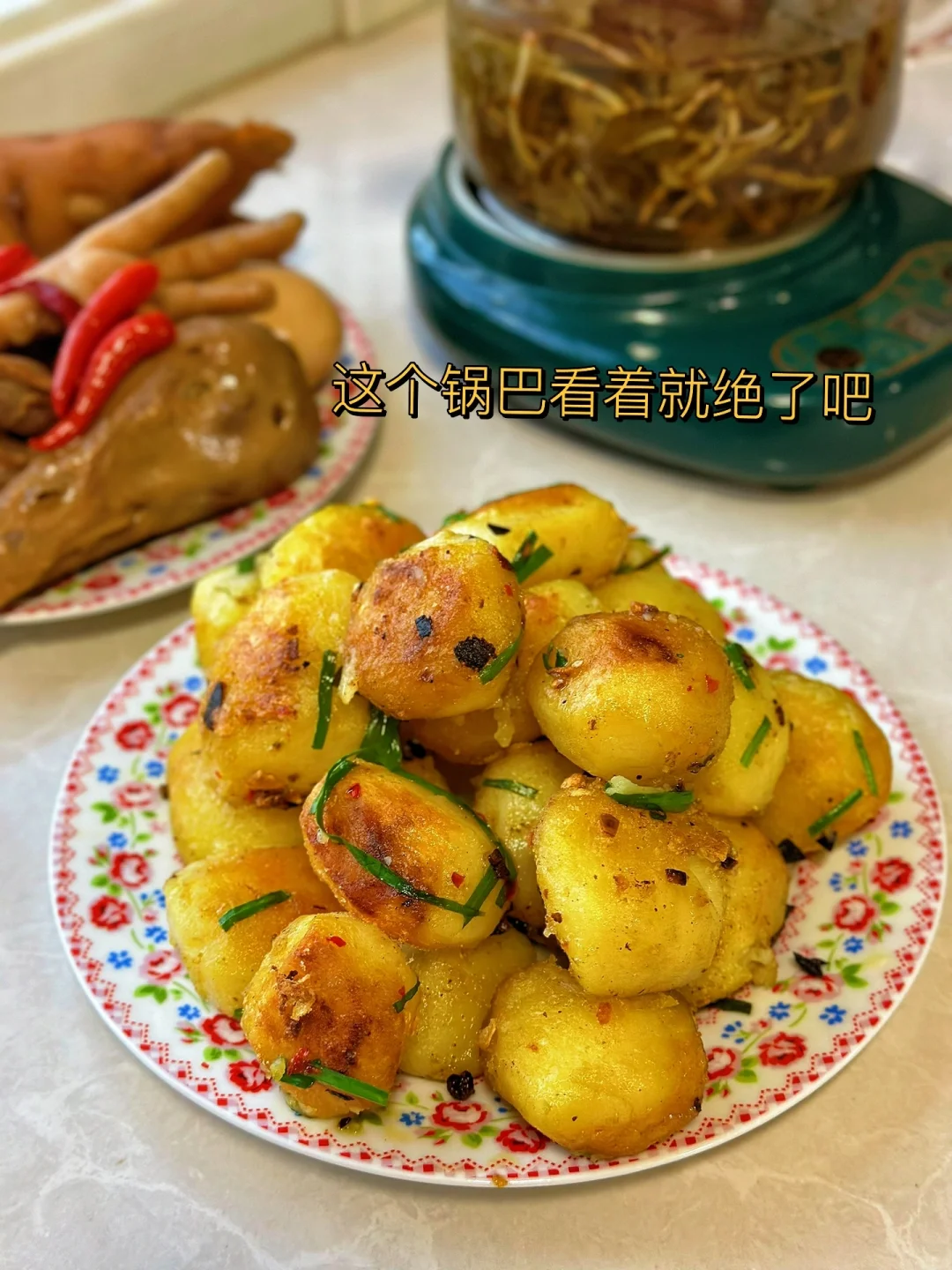 小时候记忆里的味道,那个时候住在乡下都是那种灶台大铁锅,每次土豆刚挖出来的时候,小小的那种削皮蒸好用铁锅煎一下随便放点盐都很好吃,这次回老家从舅舅家拿了很多土豆带了一些回来粉粉糯糯的特别好吃 1. 我舅舅家种的土豆,特别粉粉的,可能是温度的关系吧就这样放着也不会变绿也不会长芽 2. 削皮,上锅蒸熟,家里有高压锅的话快 3. 铁锅烧热多放一点油一定要多烧一会儿,撒盐 4. 蒸好的土豆放进去转中小火慢慢煎制金黄微微焦的时候加入少许大蒜生姜沫 5. 喜欢吃辣的亲放一点辣椒面会更提味,加入适量盐,鸡粉,(烧烤料可以放一点) 6.出锅钱放入葱花段,我今天放的是家里自己种的韭菜苗香惨了,这个锅巴看着就绝了吧