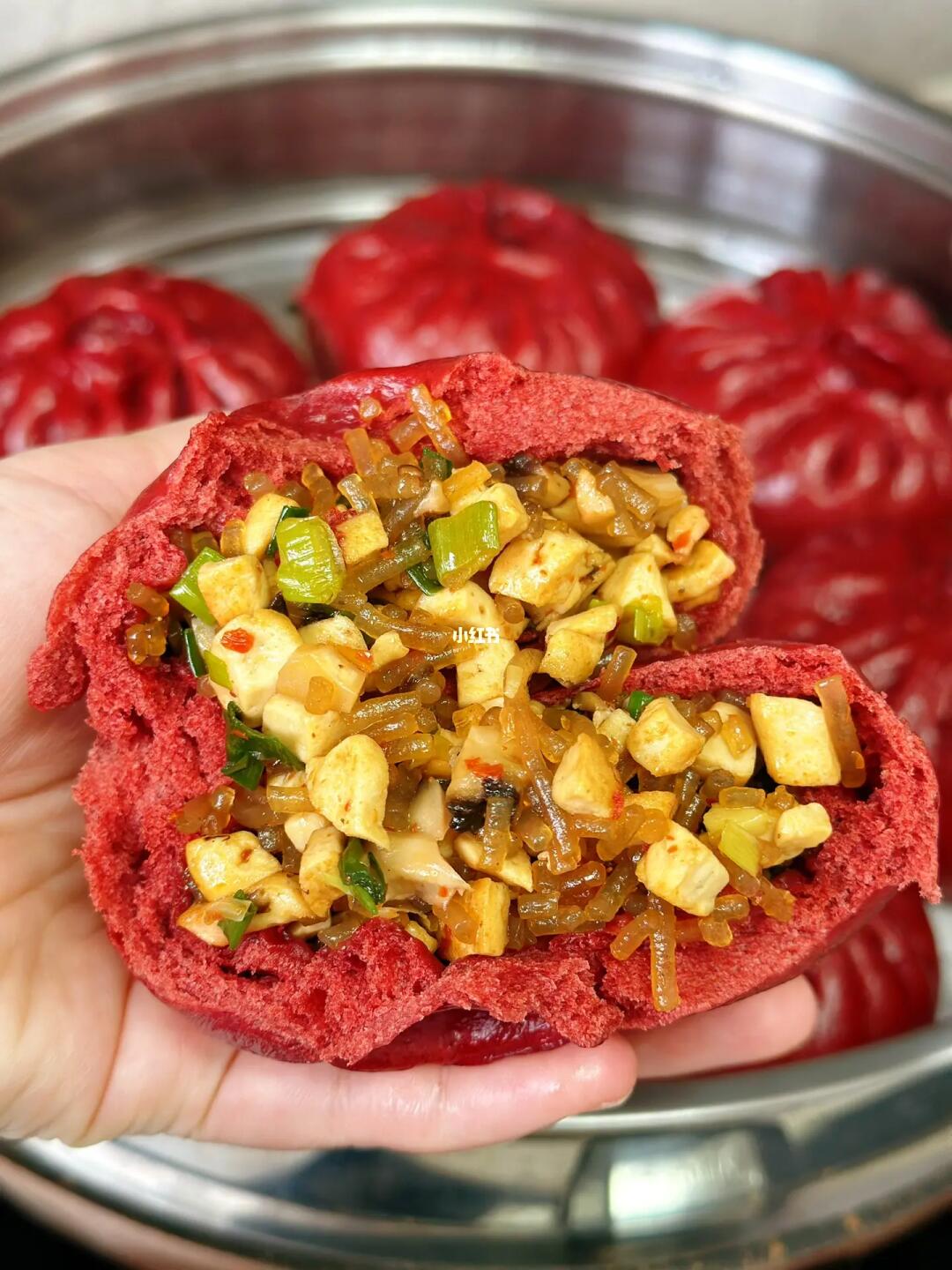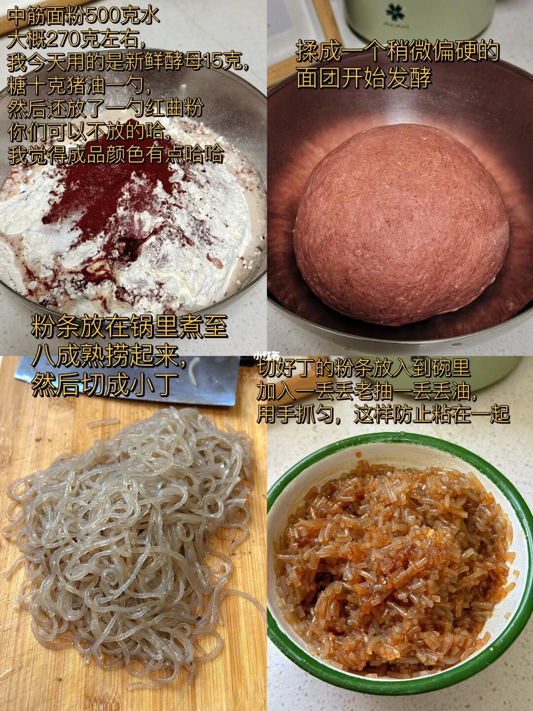 1. 中筋面粉500克水大概270克左右,我今天用的是新鲜酵母15克,糖十克猪油一勺,然后还放了一勺红曲粉你们可以不放的哈