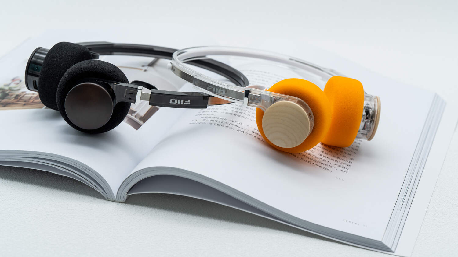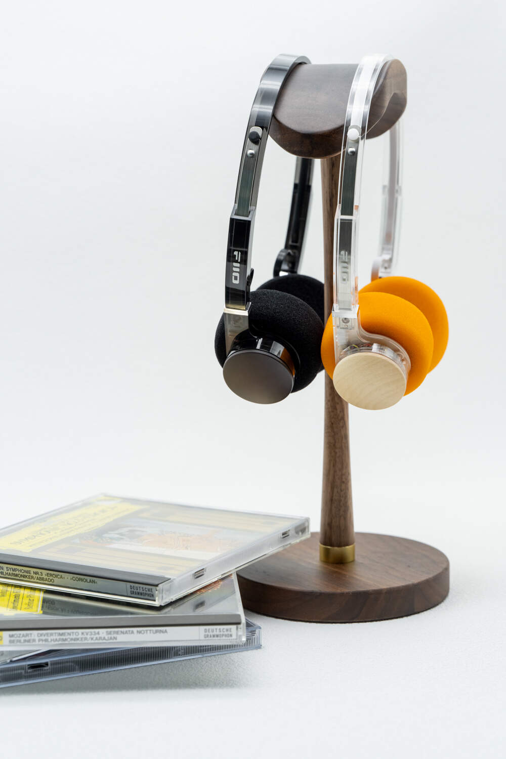 外观特征:上世纪80、90年代的复古小型头戴耳机造型,透明设计,实木单元后盖