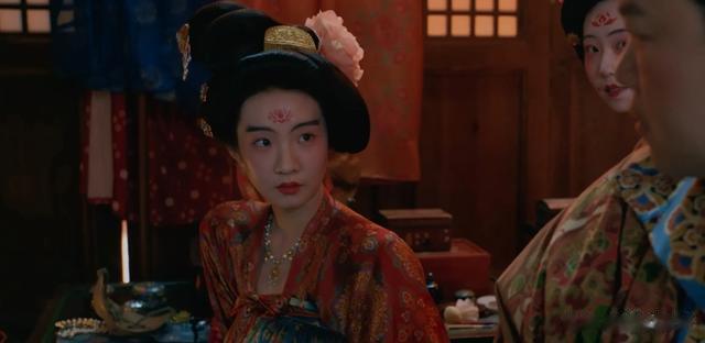 胡姬露出侧脸时略显惊艳,夸张的妆容,粗又浓的长眉,鼻翼上方还夹着一颗黑痣。