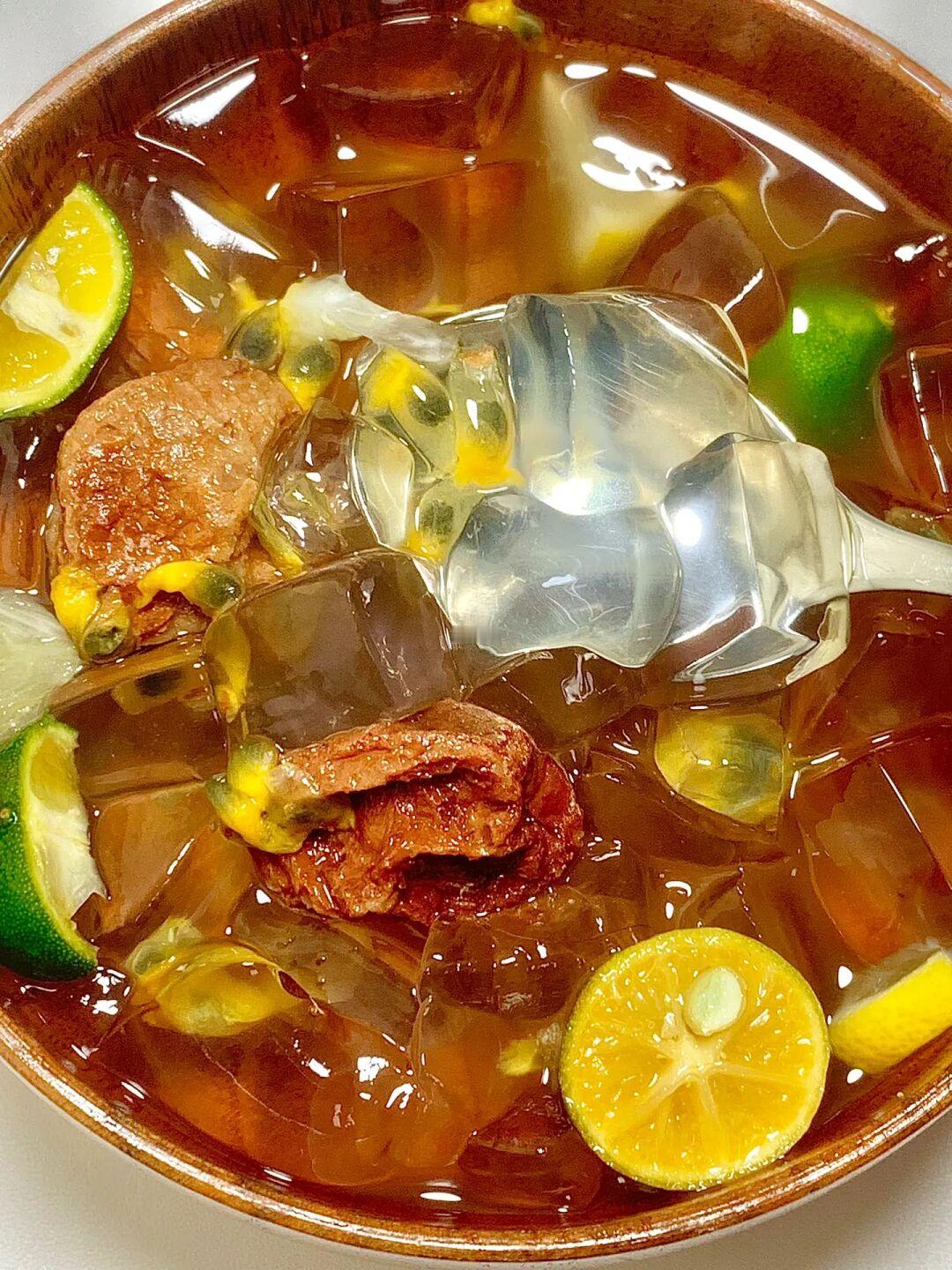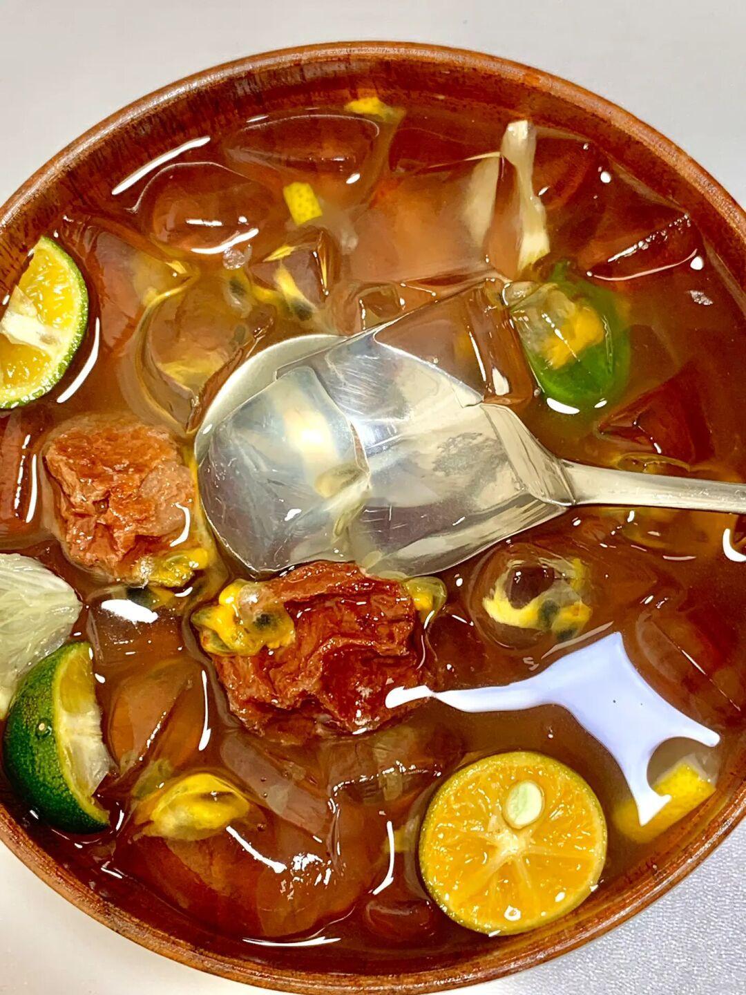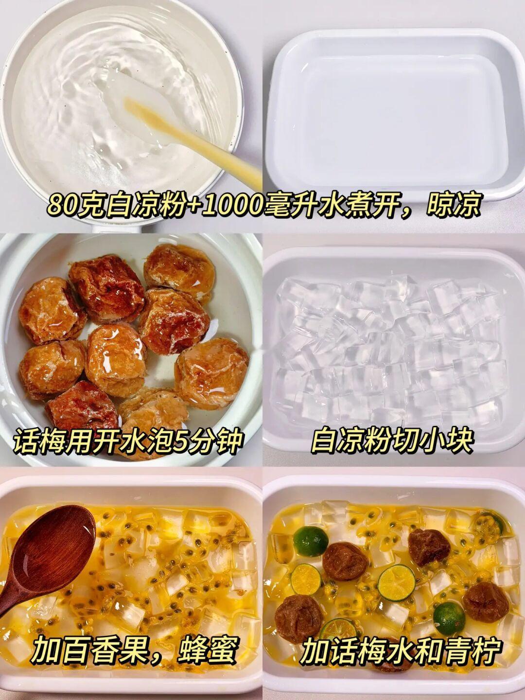 天气越来越热了[哭惹R]总喜欢吃点冰冰凉凉的东西解解暑 酸酸甜甜的百香果话梅凉粉超好喝! 你们也试试吧 🌈食材: 白凉粉80克, 清水1000毫升, 小青柠几个, 百香果2个, 蜂蜜2勺,话梅几颗。 1️⃣白凉粉加水煮沸,晾凉后了放冰箱冷藏。 2️⃣青柠去籽,话梅开水泡一下放凉。 3️⃣冷藏好的白凉粉切小块十百香果十话梅和水十小青柠十蜂蜜,拌匀开吃。