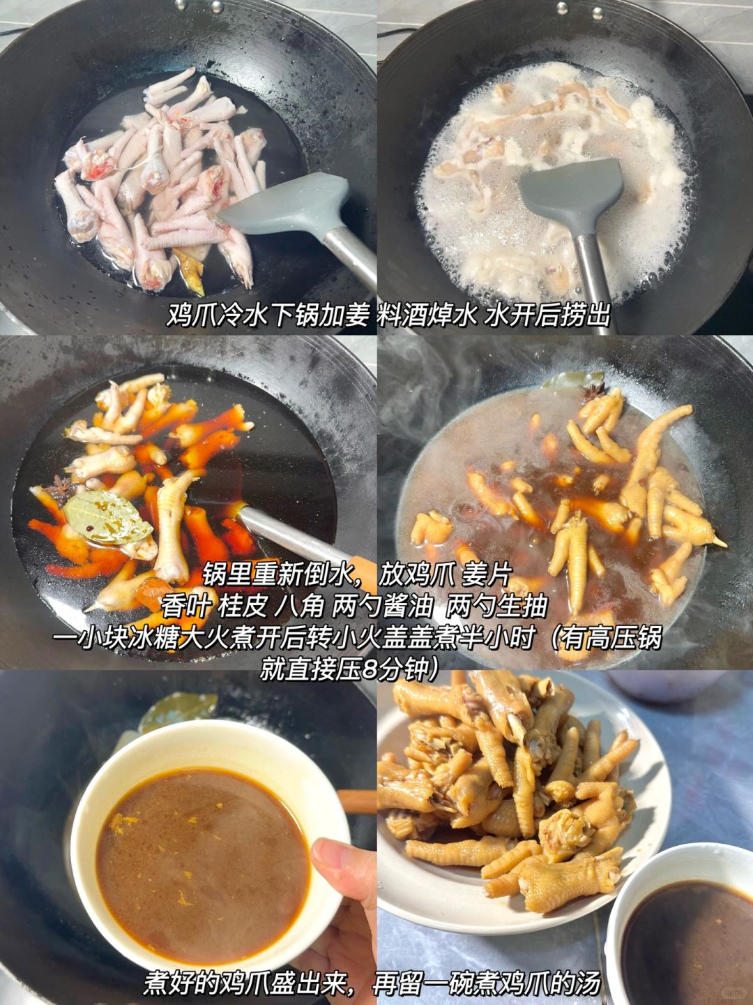 把锅洗干净,重新接水 放鸡爪 姜片 香叶 桂皮八角,两少酱油 生抽 一小颗冰糖。大火煮开后转小火盖盖煮半小时(有压力锅或者高压锅直接压8分钟,口感更好)