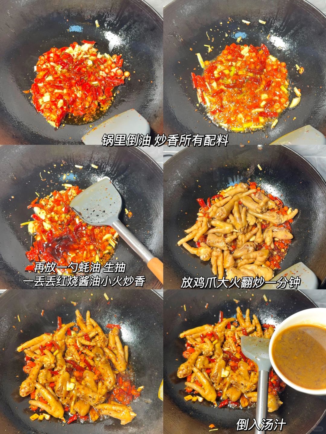 2⃣️:鸡爪煮到自己喜欢的软烂程度就可以盛出来了,再留一碗汤汁等会下锅收汁。起锅倒油,放姜蒜 葱白 所有辣椒小火慢慢炒香,再放一勺蚝油 生抽 一点点红烧酱油炒出酱香味。