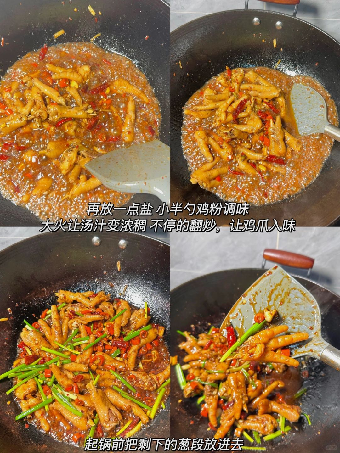 3⃣️:把鸡爪放进去大火翻炒,倒入刚才留的那碗汤汁,放一丢盐 小半勺鸡粉调味。全程大火翻炒 让汤汁收浓稠 起锅前把葱段放进去增香。