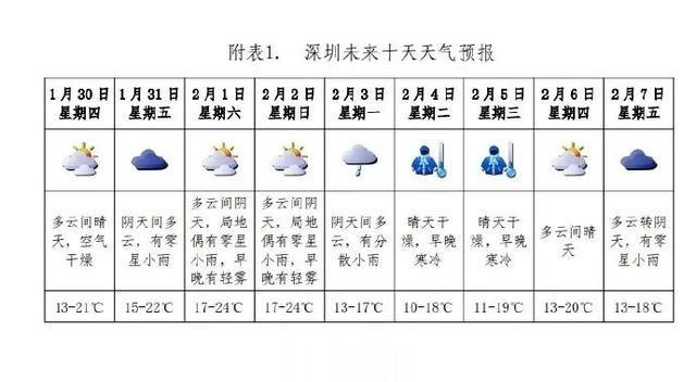 具体预报: 初二(1月30日),我省西部市县多云间阴天,有零星小雨,其余市县晴到多云。 初三(1月31日),我省大部多云到阴天有小雨,中西部市县和粤西海面早晚有(轻)雾。最低气温:粤北和粤东偏北市县8~12℃,珠江口附近和粤西沿海市县15~18℃,其余市县12~15℃。 初四(2月1日),我省东部市县多云到阴天有小雨,局部中雨,其余市县多云间阴天,有分散小雨,大部分市县和中西部海面早晚有(轻)雾。最低气温:粤北和粤东市县12~14℃,粤西沿海市县17~19℃,其余市县15~17℃。 初五(2月2日) ,粤北和粤西市县多云到阴天,有小雨,其余市县多云间阴天,有分散小雨。中南部市县和中西部海面早晚有(轻)雾。受冷空气影响,粤北气温开始下降,最低气温:粤北市县8~12℃,粤西沿海市县18~20℃,其余市县14~17℃。 初六(2月3日) ,我省大部阴天有小雨。大部气温明显下降,最低气温:粤北市县4~8℃,中部市县9~12℃,南部市县13~16℃。 初七(2月4日) ,我省大部市县转多云到晴。最低气温:粤北市县3~6℃(高海拔山区-2~0℃),中部市县6~9℃,南部市县9~14℃。