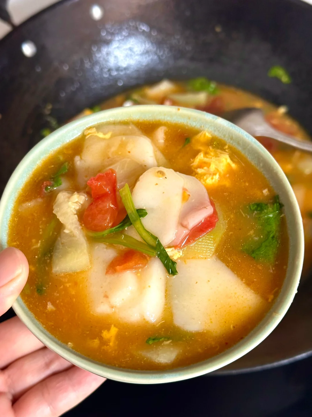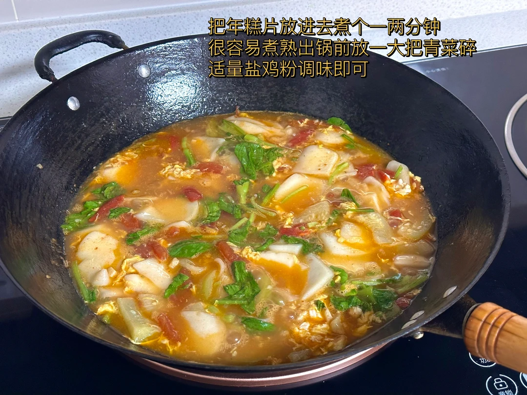 5. 把年糕片放进去煮个一两分钟很容易煮熟出锅前放一大把青菜碎适量盐鸡粉调味即可
