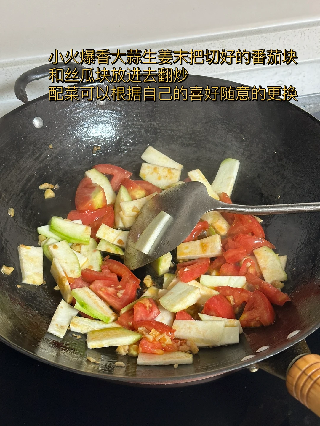 2. 小火爆香大蒜生姜末把切好的番茄块和丝瓜块放进去翻炒配菜可以根据自己的喜好随意的更换