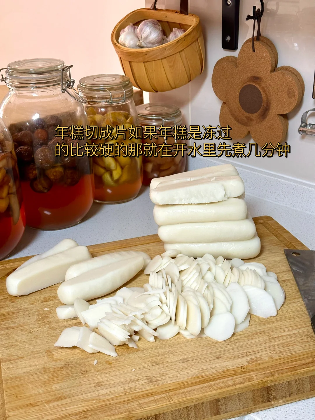 1. 年糕切成片如果年糕是冻过的比较硬的那就在开水里先煮几分钟