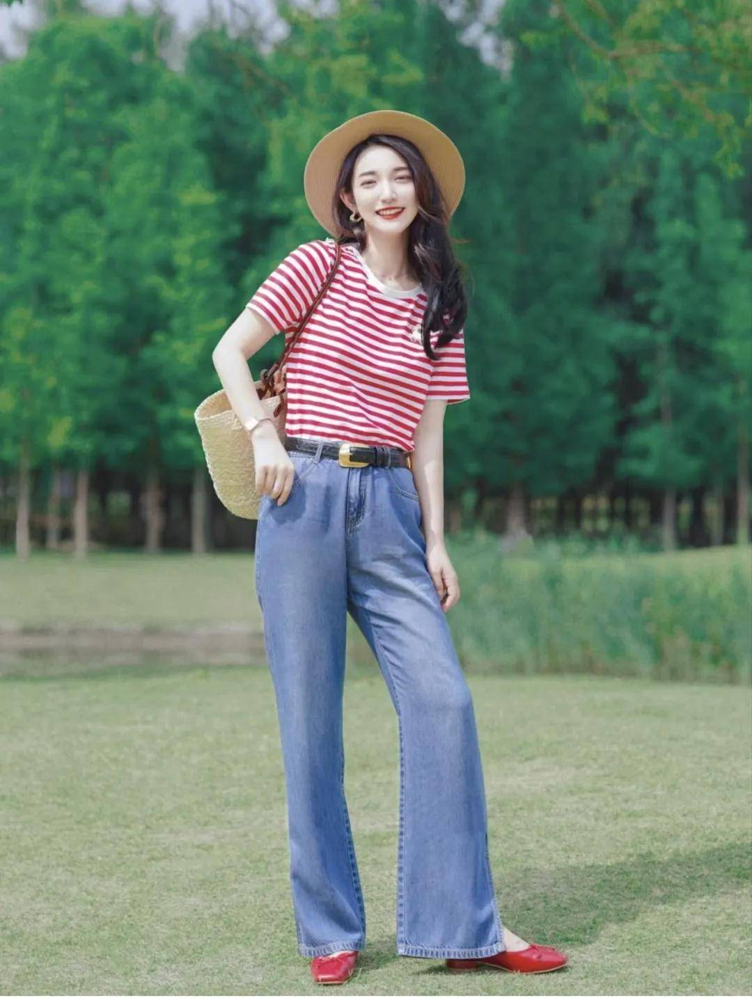 想要清新减龄风格的,可以用红色搭配蓝色,撞色的同时,加入卡其色的帽子或者包包,就像一座稳重的桥梁,连接着红色和蓝色。