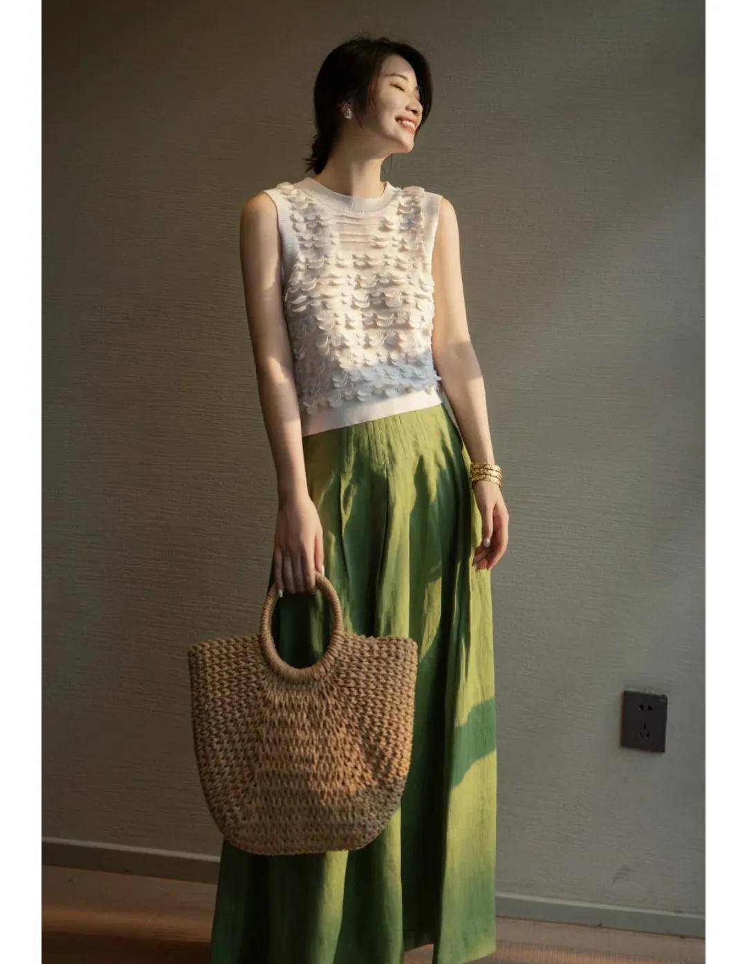 夏天如果你喜欢穿绿色,搭配白色是最清爽最减龄的搭配。