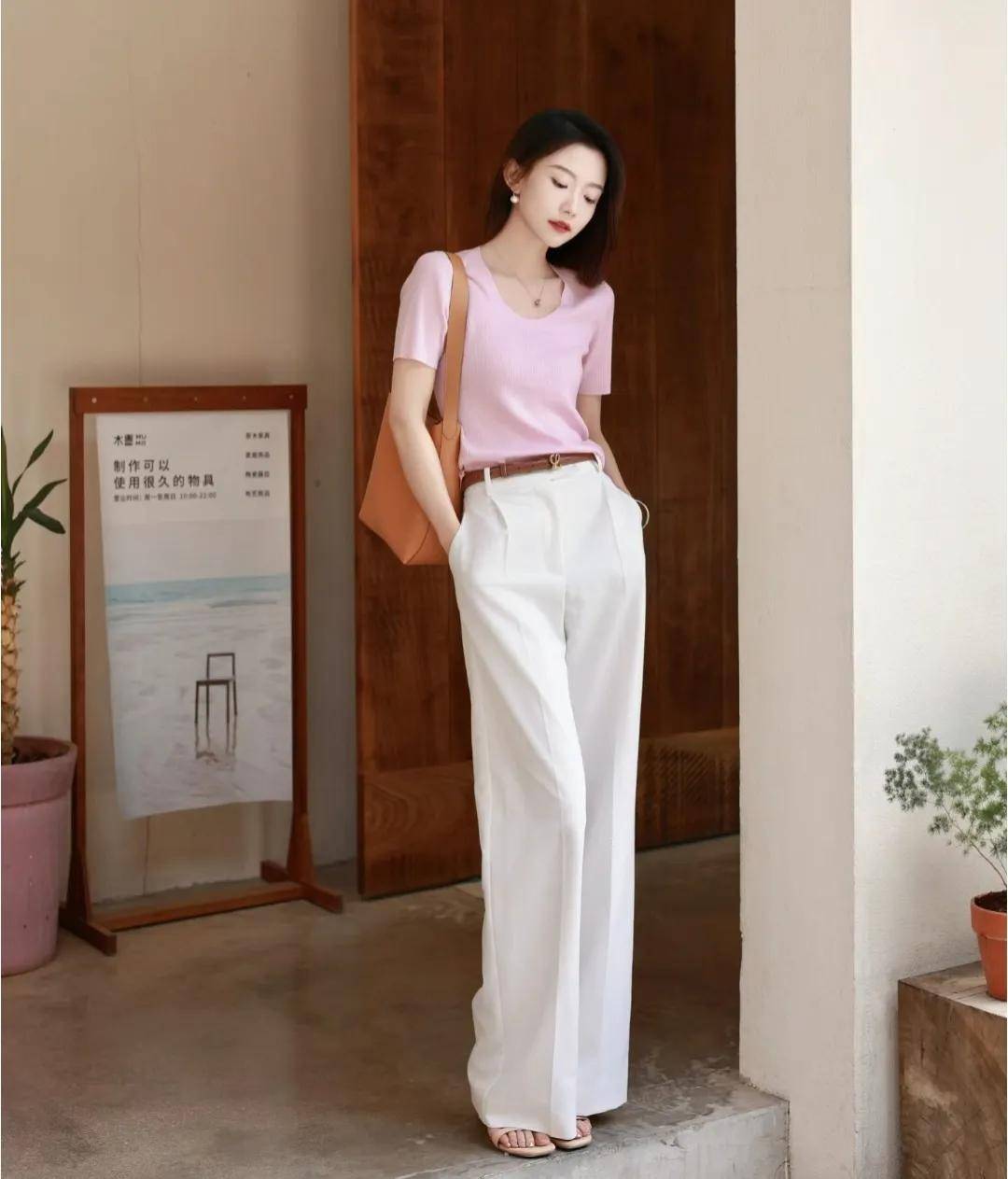 粉色的上衣搭配白色的裤子,显得清新脱俗;而棕色的腰带和鞋子或者包包,增添了整体搭配的成熟与稳重感,显得沉稳又大气。