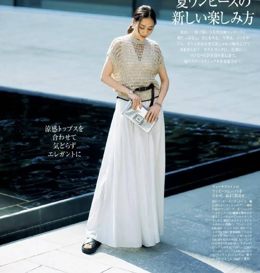 搭配一双杏色的凉鞋,与我们的皮肤很接近,更容易融合一体,显得配色更加和谐与时尚。