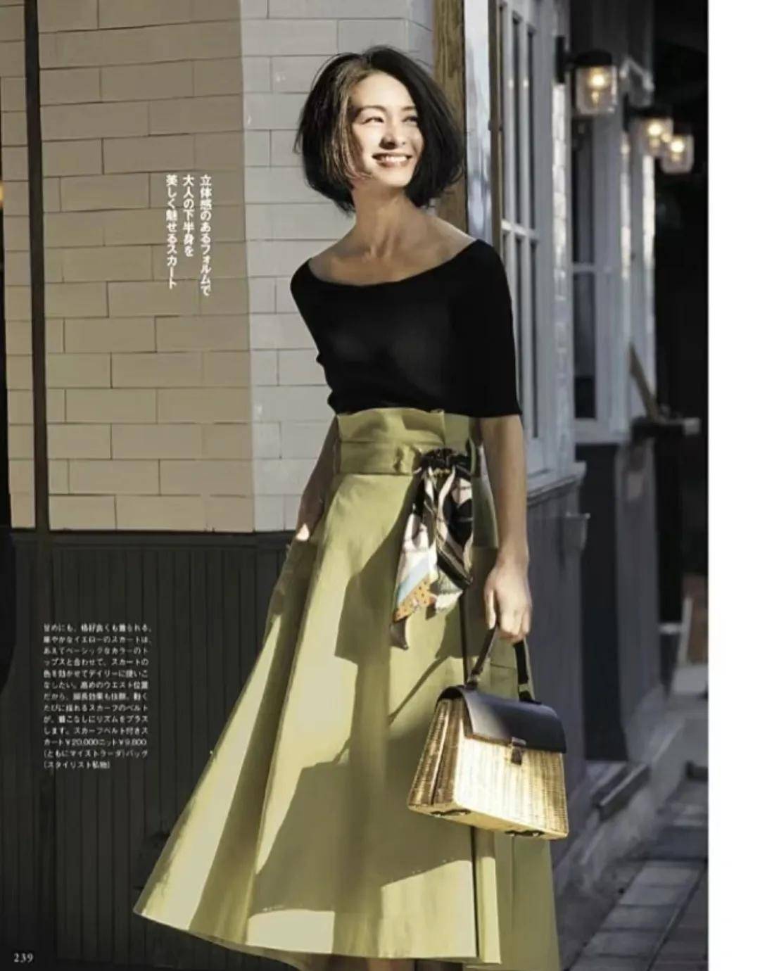 黑色的一字肩上衣搭配高腰军绿色伞裙,深沉而神秘,有一种硬朗与活力的优雅与魅力。