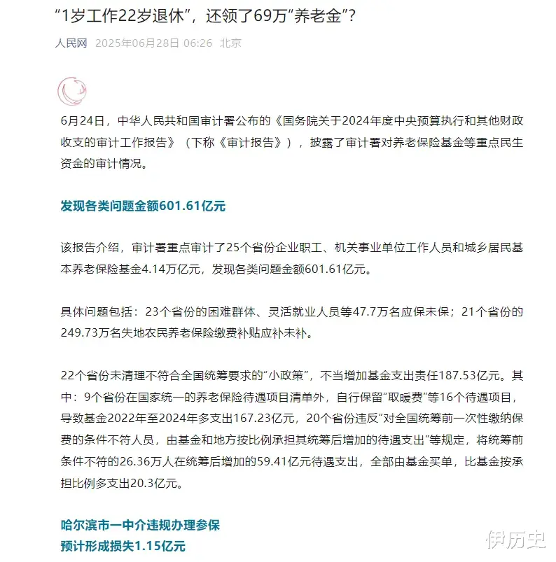 6月24日,国家审计署的一份报告,引爆了整个舆论场。一个“1岁工作,22岁退休”的山西“神童”,一份涂改14次却能层层过审的档案,一笔高达69万元的违规养老金——这些数字像一记重拳,狠狠地砸在了每个老实缴费的普通人心里。