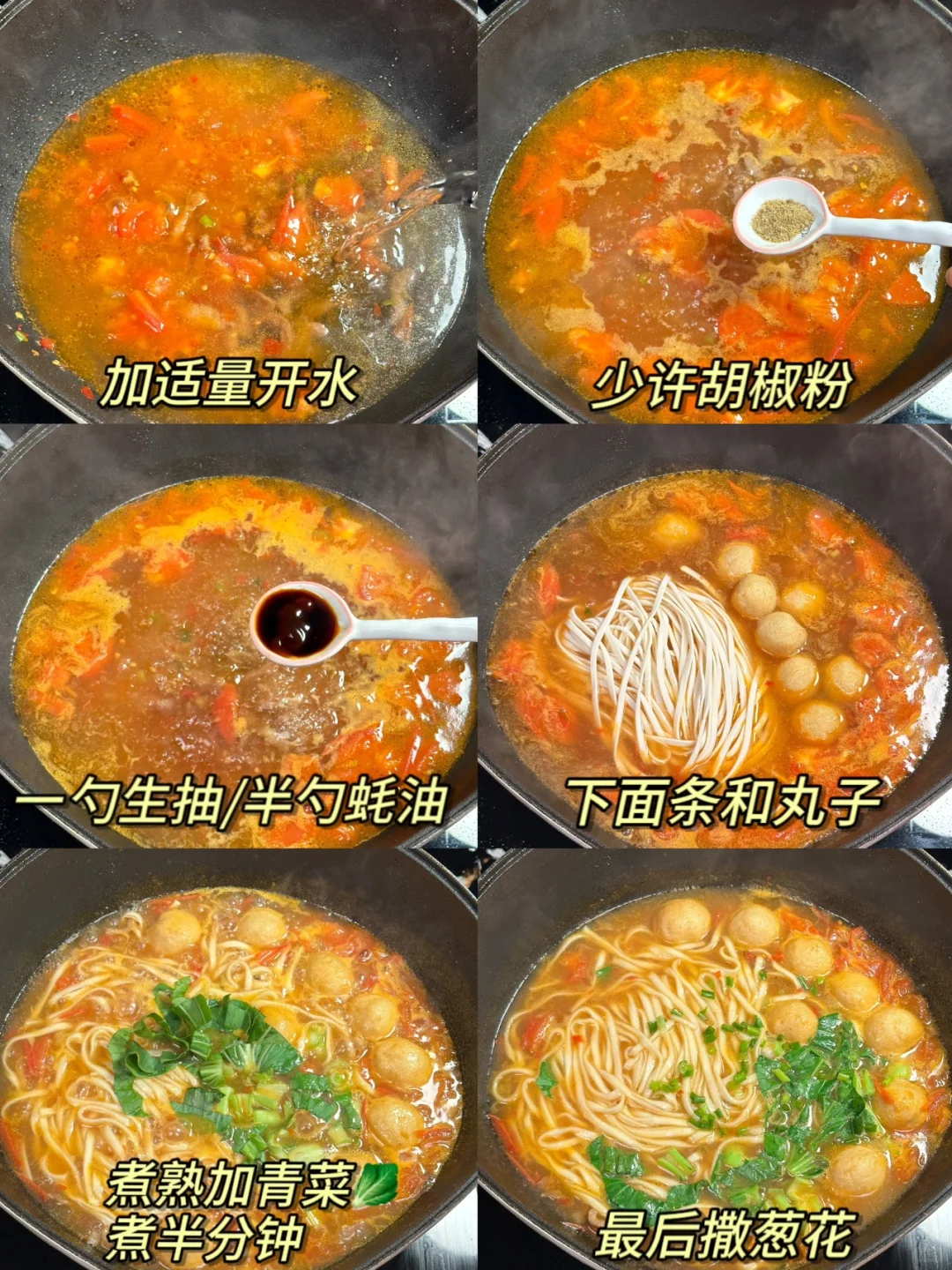 🍀🍀做法:1️⃣起锅热油,下肉丝翻炒变色,加葱末和一勺蒜蓉酱炒出香味,接着倒入番茄块炒软,加适量开水(约2碗)一勺生抽,半勺蚝油,少许胡椒粉调味