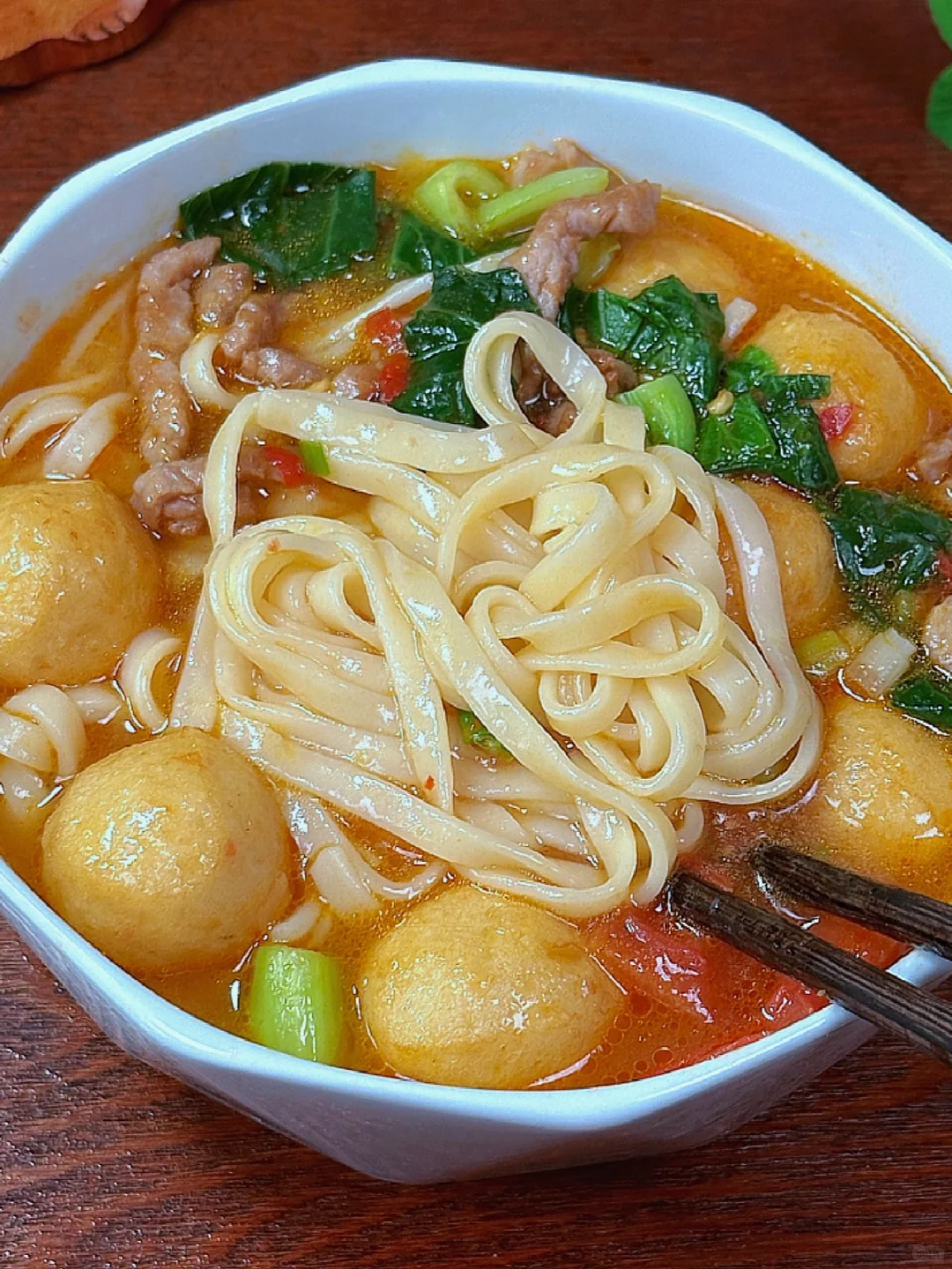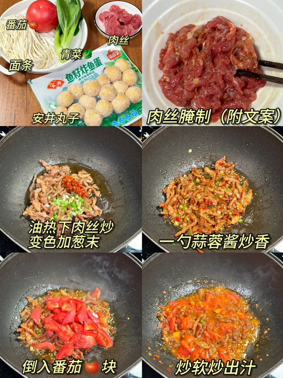 🍀🍀食材:面条1份,番茄🍅1个,肉丝150g,青菜🥬1颗,葱1根,安井丸子1份