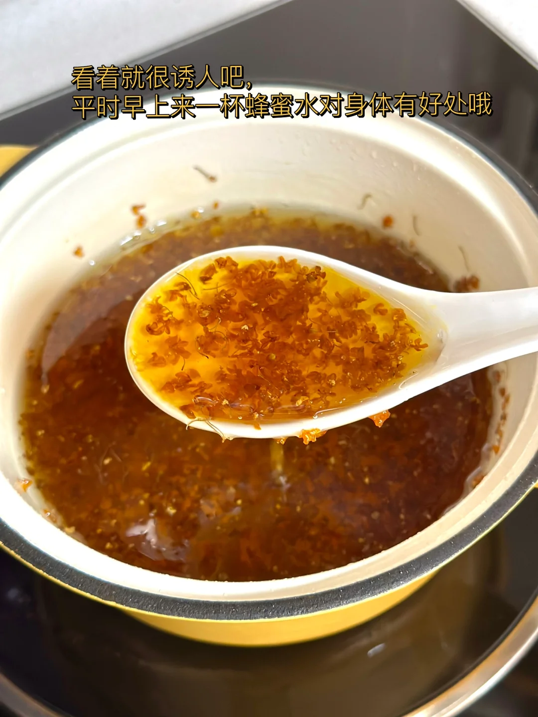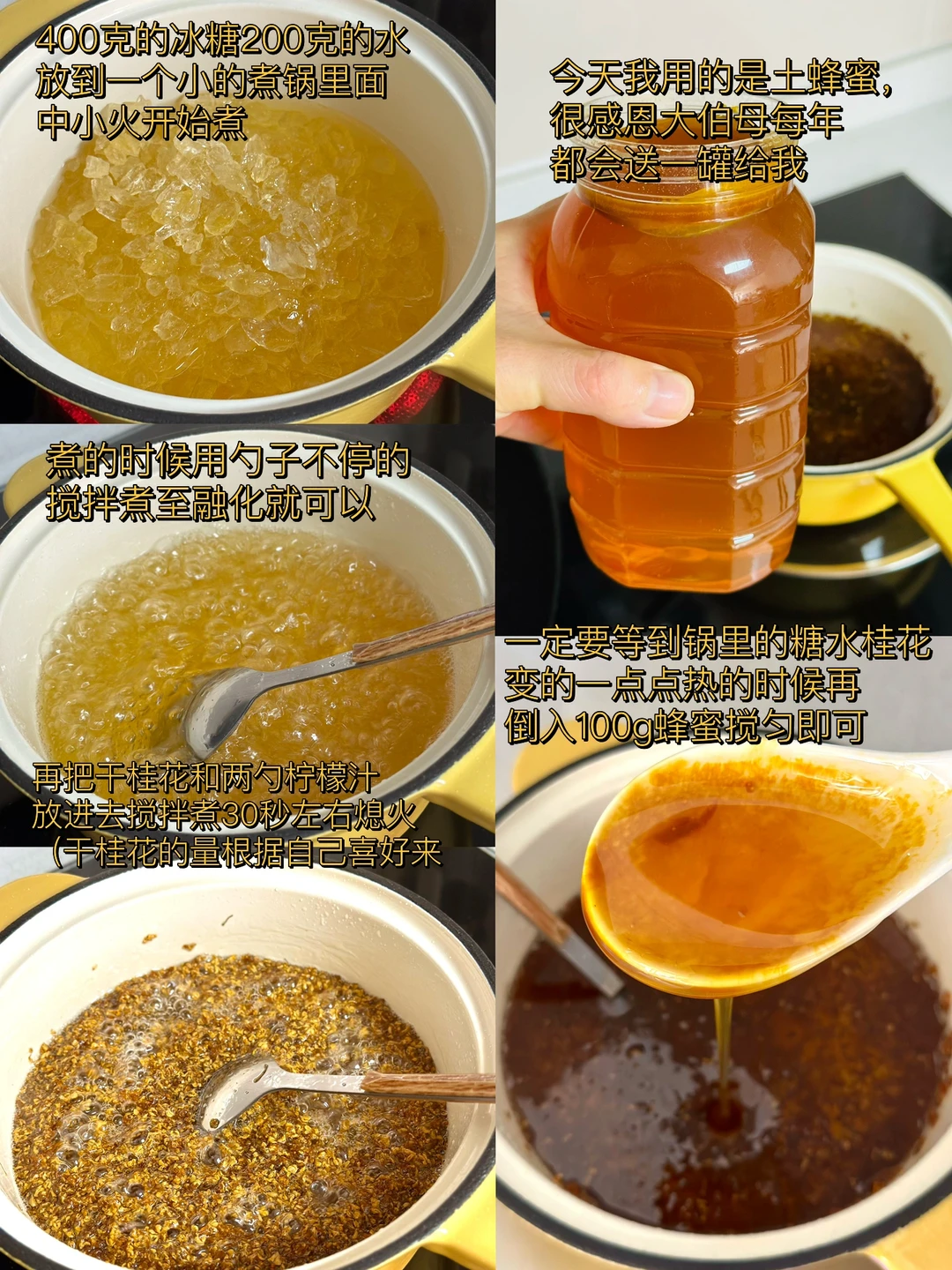 8. 一定要等到锅里的糖水桂花变的一点点热的时候再倒入100g蜂蜜搅匀即可