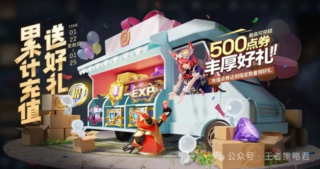 累计充值(1.22-1.25):囤囤党冲 300 点券档位即可解锁全部奖励,荣耀积分、积分夺宝券、皮肤碎片一键拿下,冲王昭君 FMVP 皮肤的玩家顺便参与,多领一波福利。