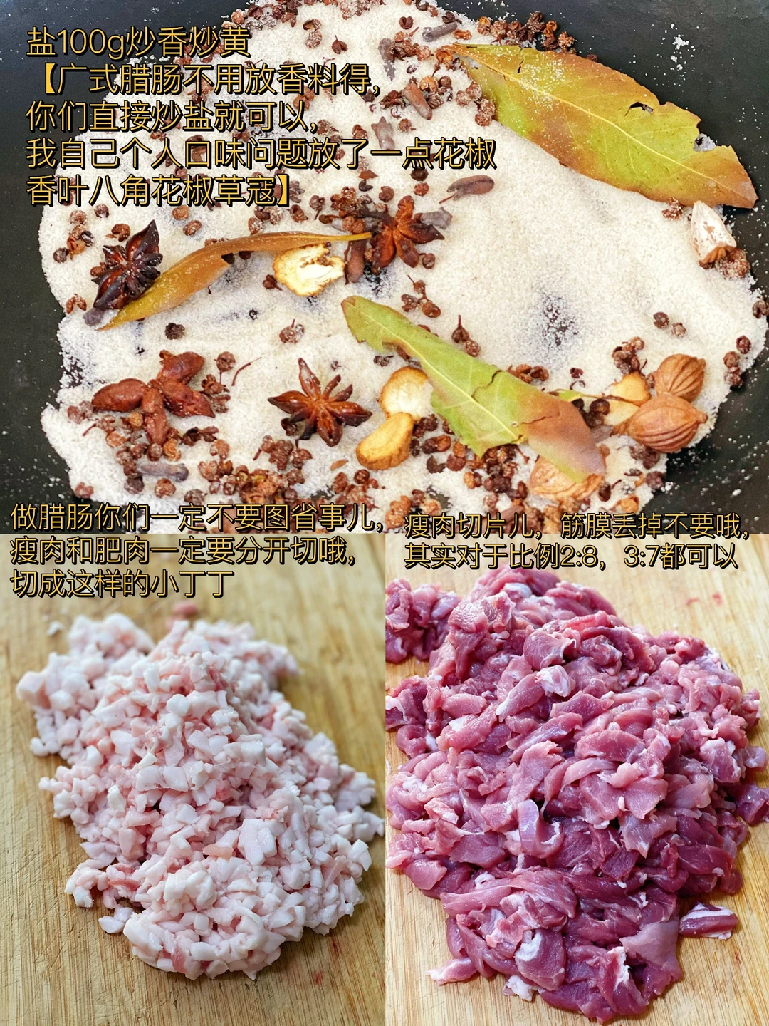1. 盐100g炒香炒黄【广式腊肠不用放香料得,你们直接炒盐就可以,我自己个人口味问题放了一点花椒香叶八角花椒草寇】