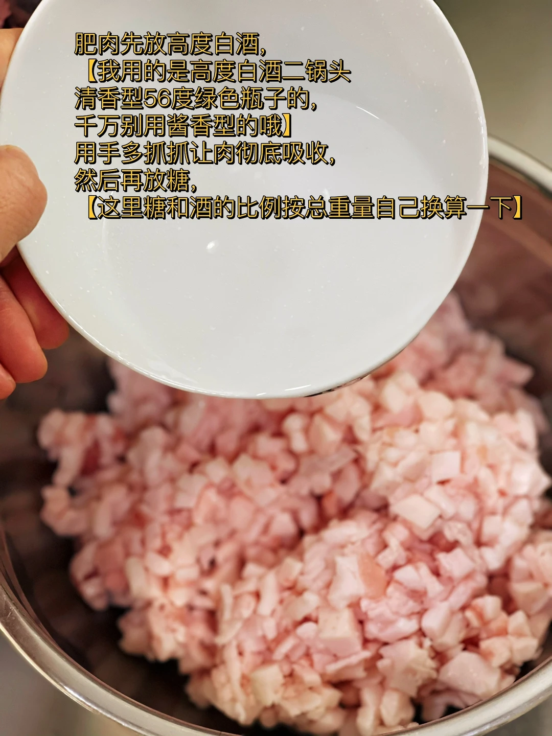 4. 肥肉先放高度白酒,【我用的是高度白酒二锅头清香型56度绿色瓶子的,千万别用酱香型的哦】用手多抓抓让肉彻底吸收,然后再放糖,【这里糖和酒的比例按总重量自己换算一下】