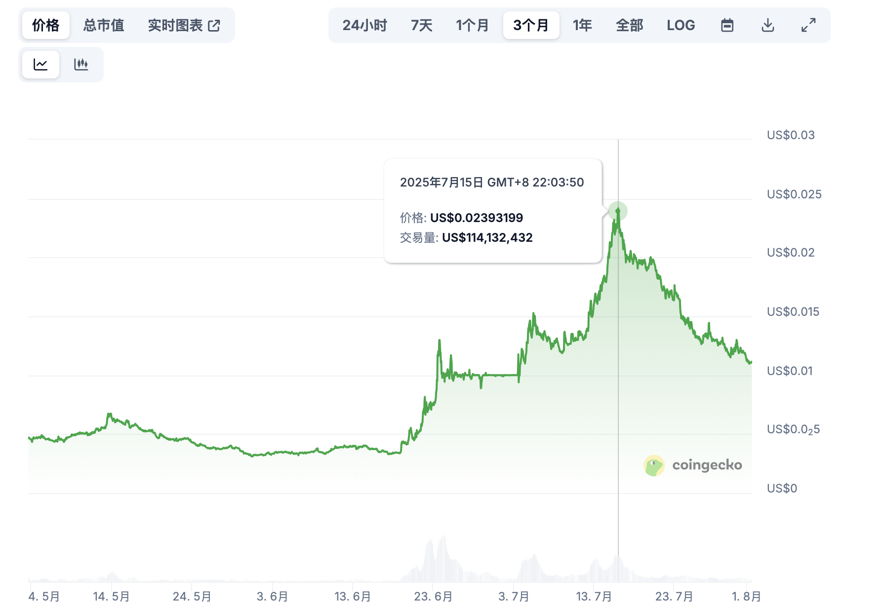 通过促进社交平台与加密激励的深度融合,FUNToken的社区规模迅速扩大,活跃互动频次大幅提升。截至2025年8月1日,平台活跃用户稳居10万以上,其官方聊天群同时在线用户数通常高于1万人。随着生态的逐渐繁荣,FUN代币价格也开始同步猛增。据CoinGecko数据,从6月中旬开始,FUN代币从底部的0.0033美元一路上行,最高在7月中旬涨至0.0239美元。