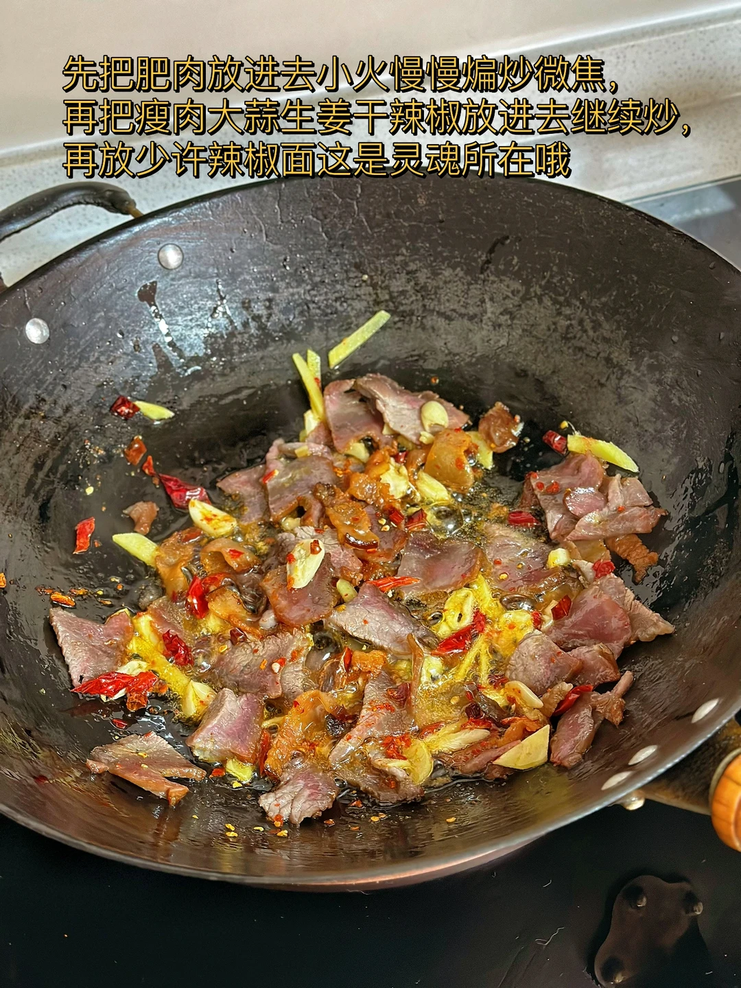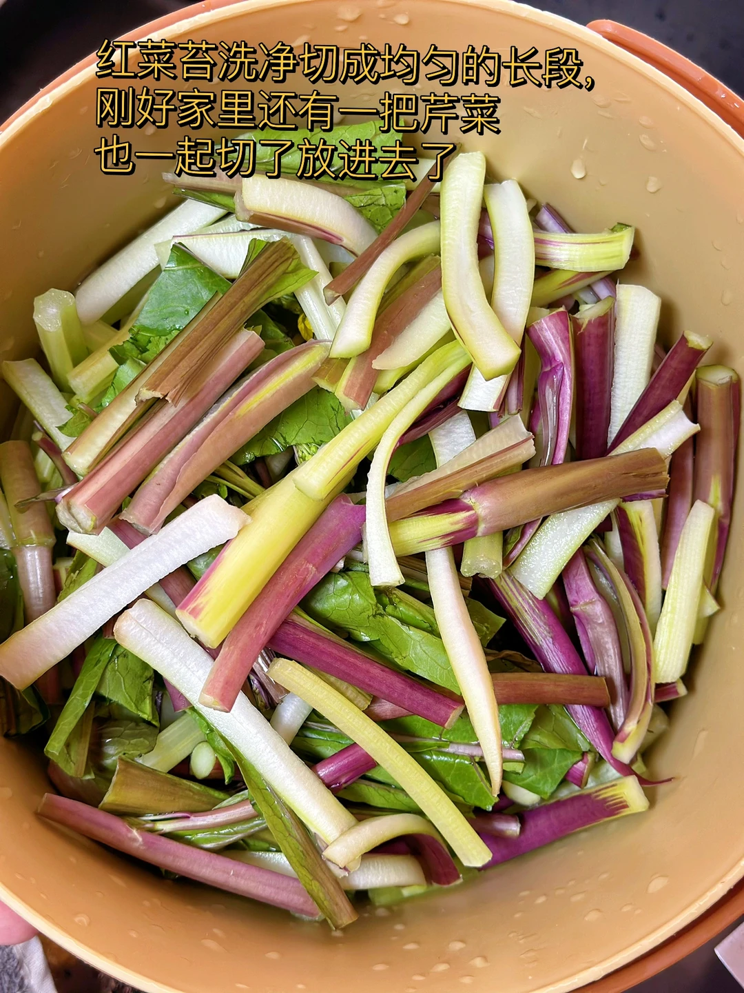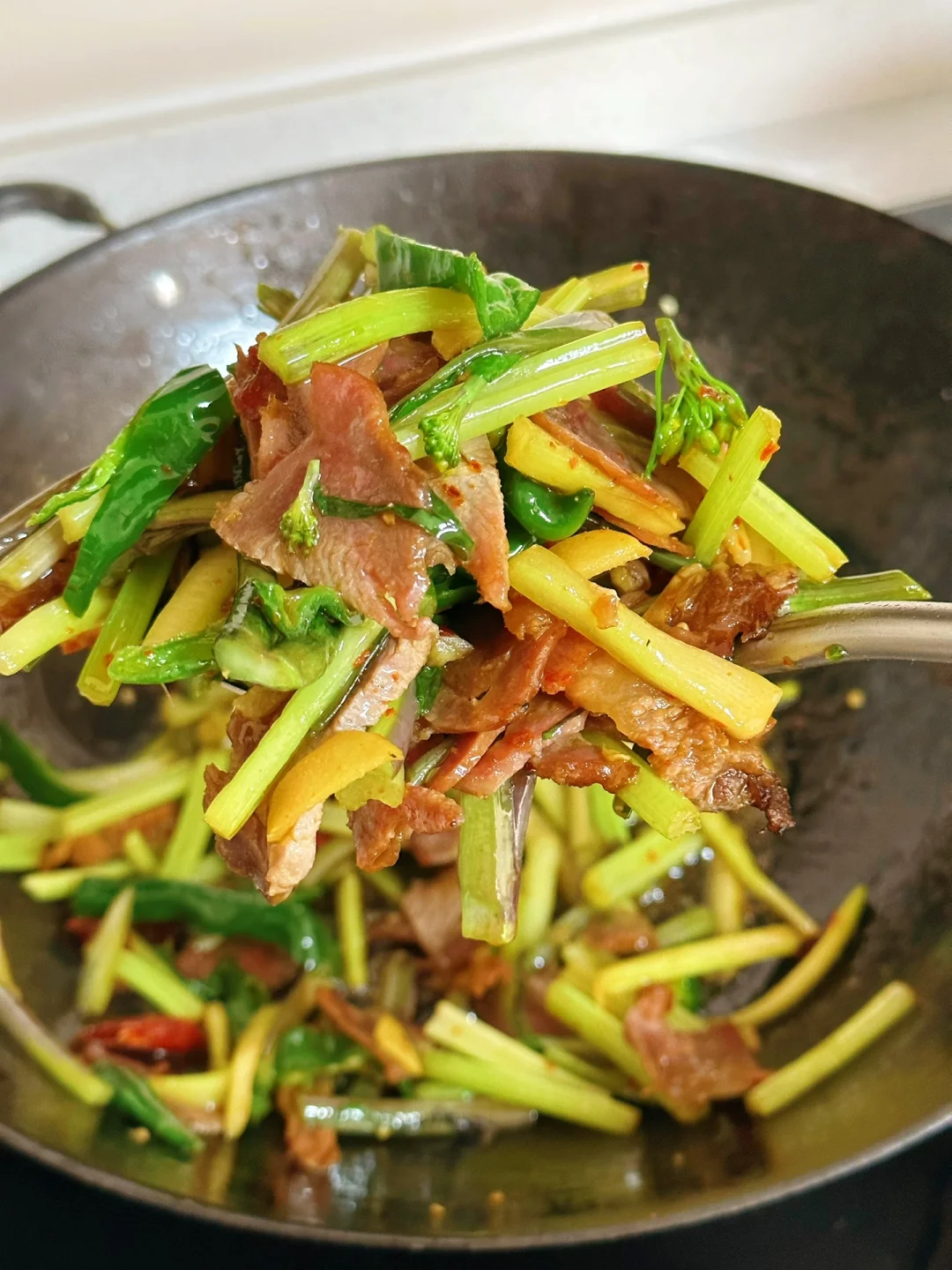 在我们大湖北红菜苔的地位真的,每个冬天基本都是餐桌上的主菜,而且家家户户基本都有腊肉这一搭配简直就是下饭神器 前几天家附近小店看见红菜苔太开心了,赶紧买了一把,刚好冰箱里剩下一丢丢就一起炒了 香惨了一个人吃的太开心 1. 红菜苔洗净切成均匀的长段,刚好家里还有一把芹菜也一起切了放进去了 2. 腊肉洗干净肥瘦肉分开切【如果你们做的腊肉比较咸一定要热水先泡在煮会儿,不然没办法吃】 3. 先把肥肉放进去小火慢慢煸炒微焦,再把瘦肉大蒜生姜干辣椒放进去继续炒,再放少许辣椒面这是灵魂所在哦 4. 洗干净的红菜苔放进去转大火快速翻炒三四分钟,加入一勺薄盐生抽,半勺蚝油,适量盐鸡粉糖 5. 出锅前撒一把葱段,或者蒜苗也可以哦