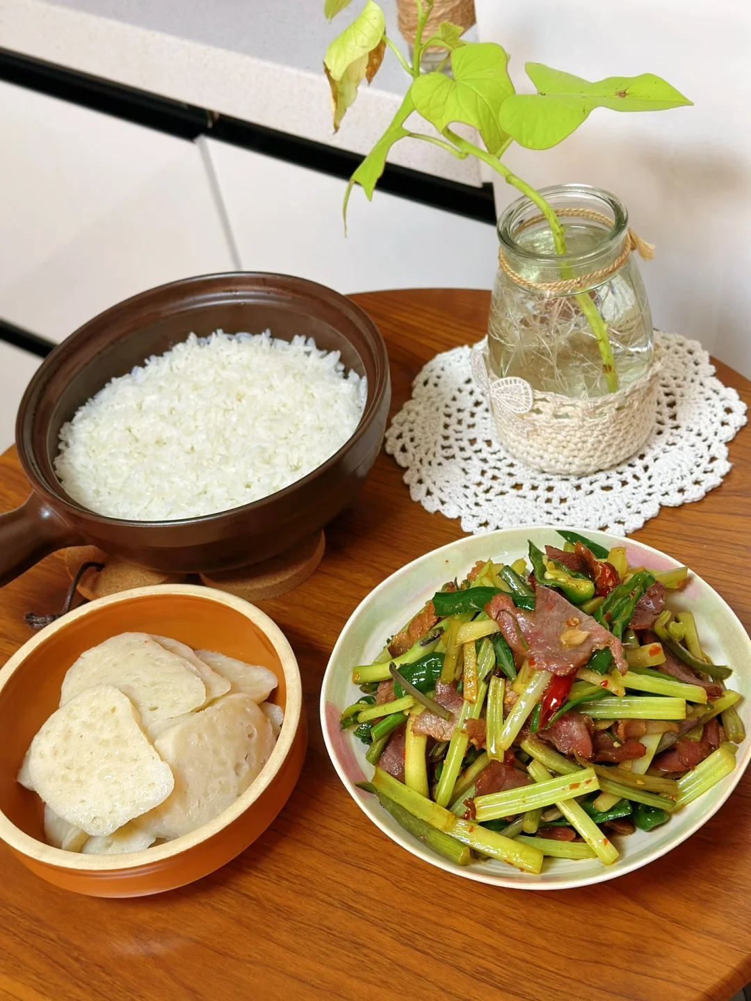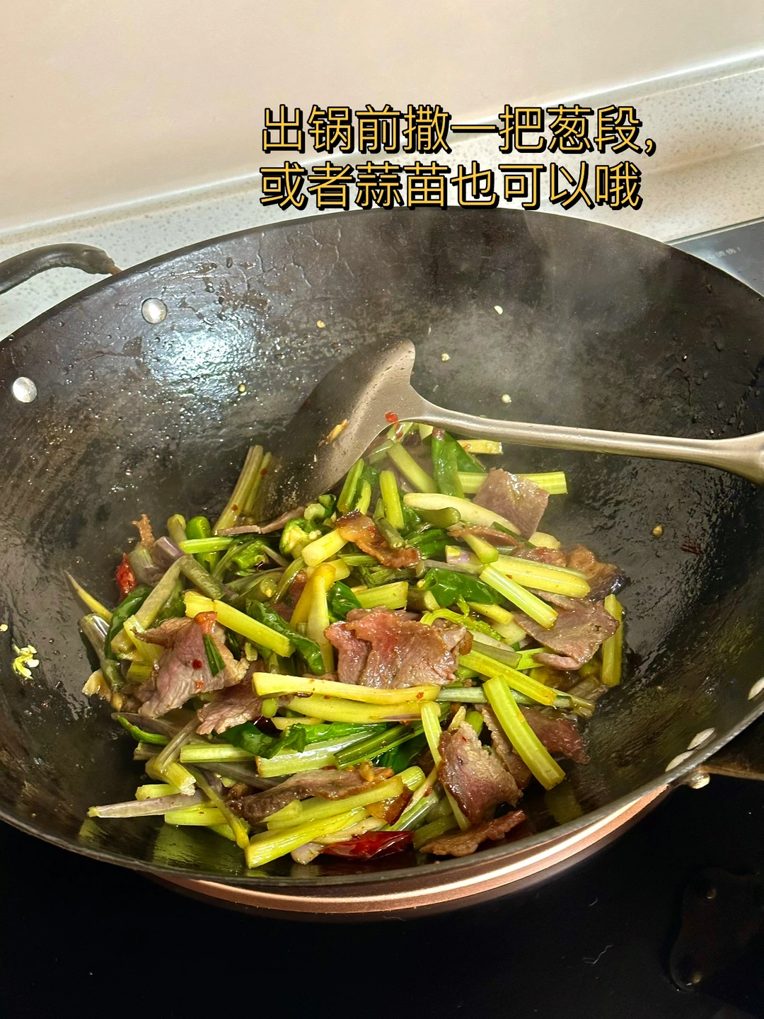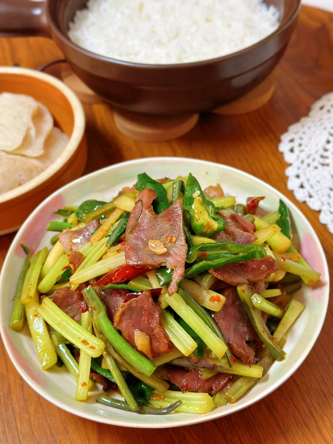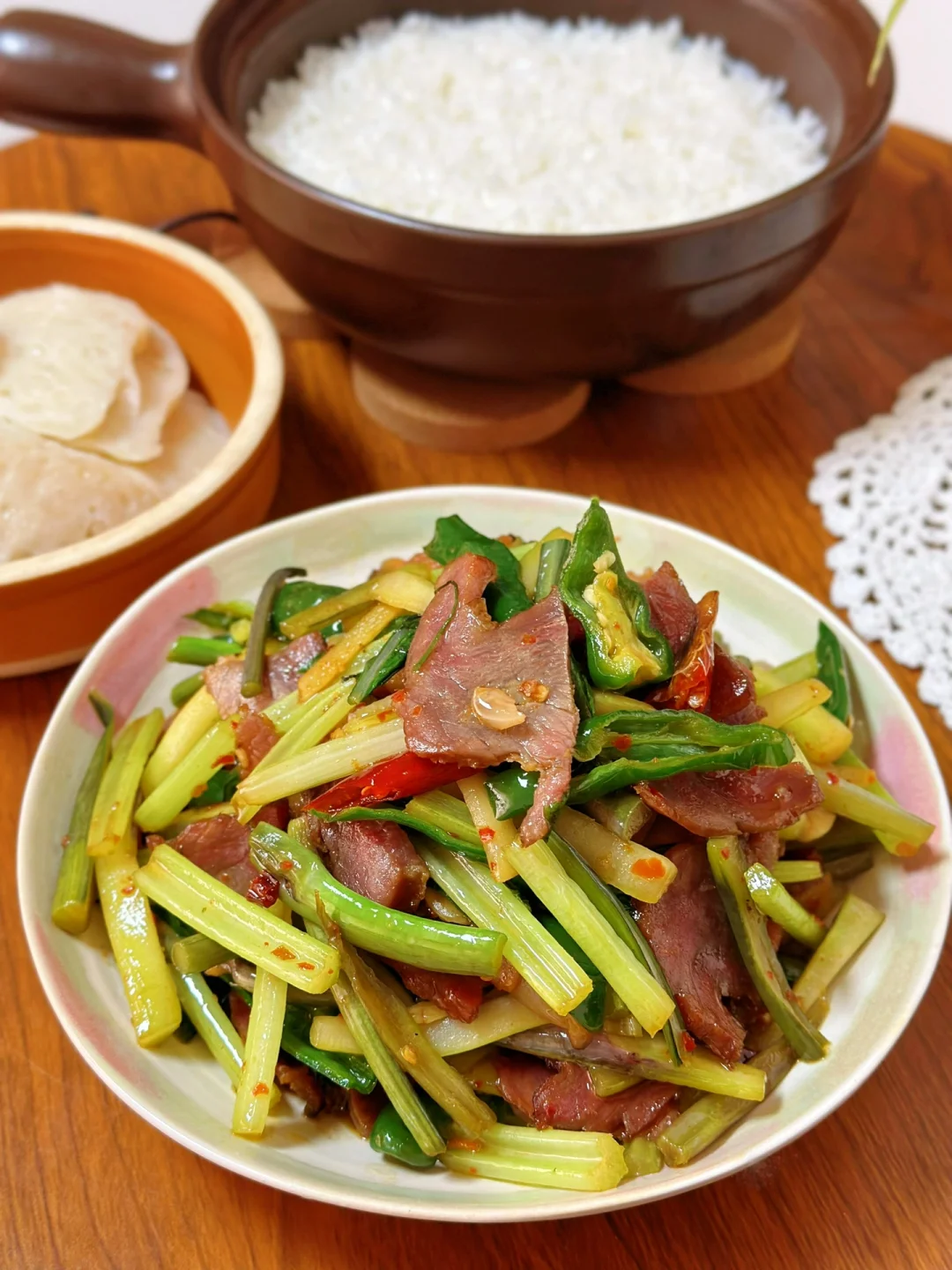 在我们大湖北红菜苔的地位真的,每个冬天基本都是餐桌上的主菜,而且家家户户基本都有腊肉这一搭配简直就是下饭神器 前几天家附近小店看见红菜苔太开心了,赶紧买了一把,刚好冰箱里剩下一丢丢就一起炒了 香惨了一个人吃的太开心 1. 红菜苔洗净切成均匀的长段,刚好家里还有一把芹菜也一起切了放进去了 2. 腊肉洗干净肥瘦肉分开切【如果你们做的腊肉比较咸一定要热水先泡在煮会儿,不然没办法吃】 3. 先把肥肉放进去小火慢慢煸炒微焦,再把瘦肉大蒜生姜干辣椒放进去继续炒,再放少许辣椒面这是灵魂所在哦 4. 洗干净的红菜苔放进去转大火快速翻炒三四分钟,加入一勺薄盐生抽,半勺蚝油,适量盐鸡粉糖 5. 出锅前撒一把葱段,或者蒜苗也可以哦