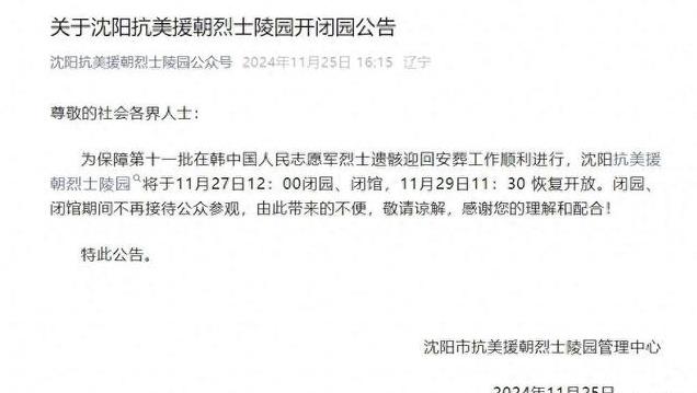沈阳抗美援朝烈士陵园也在11月27号12点闭园,不接受民众参观,在安葬好烈士后,将会恢复开放。