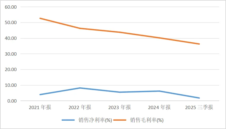 净利率从2024年同期的约5.58%降至2025年前三季度的1.74%,同比降幅达73.02%,显示公司在收入下降的同时,费用控制未能有效改善。