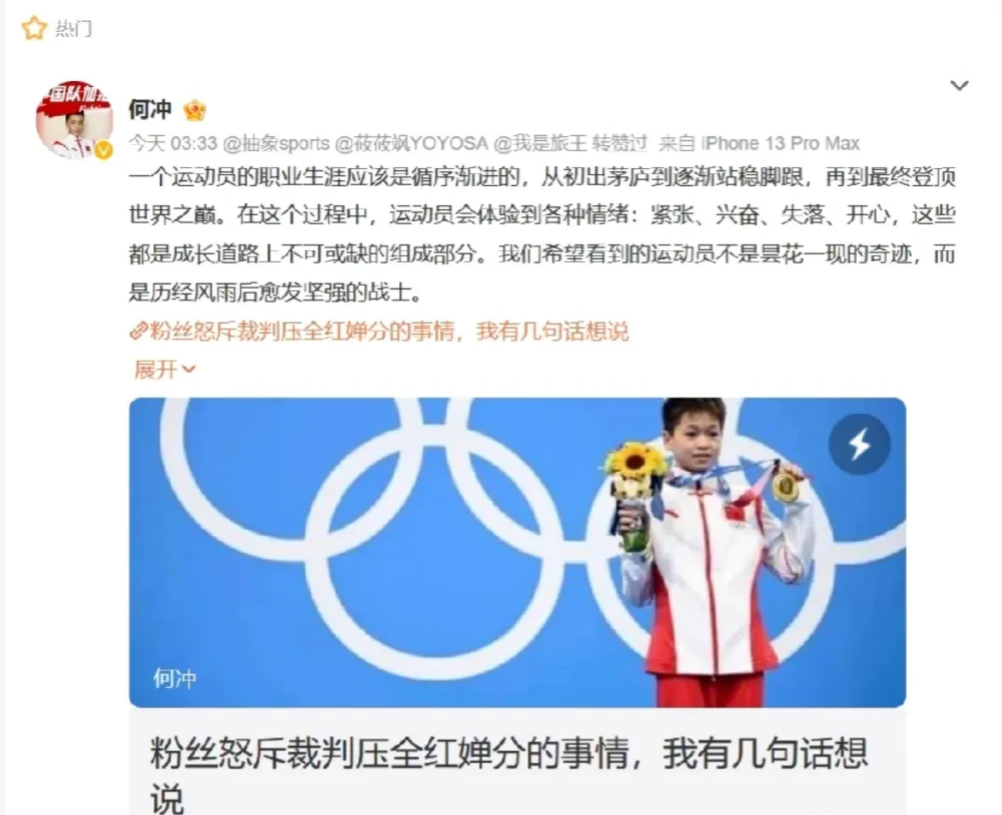 奥运冠军发文怒斥“这非常可怕”!日前进行的2023年全国跳水锦标赛10米台决赛中,陈芋汐以436.80分夺冠,全红婵以427.60分获得亚军。但赛后发生了不和谐的一幕——一位粉丝在看台上大吼,认为“裁判不公,故意压全红婵的分”。都是国家宝贝何须另眼以既生瑜何生亮。这个何明显想蹭热度,过期就过期吧!一个跳水运动员不从技术的角度分析两人的优劣,反而将粉丝的抱怨埋怨成饭圈文化,其心可诛。比照两人同一个跳水动作,非专业角度看上去全的质量优于另一人。这种情况下,同一个裁判给全8分,给另一个10分,不知为什么?“每一个成绩背后,都有无数人的付出和整个国家的期待”个人认为,我们的运动员背负的东西太多了(这与我们举国体制有关),早年的李宁(88汉城)、后来的刘翔(08北京)等人,一旦失利,群起而攻之,实在可怕。无论是运动员还是观众,应该借鉴一些国家,输赢都坦然面对。