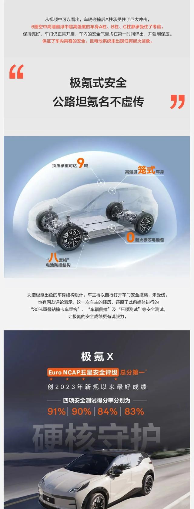 更让人印象深刻的是,极氪X的电池包在设计中也考虑到了安全性,采用了多层保护结构,包括底部的蜂窝铝防刮、侧面的双纵梁抗撞设计,以及顶部的防火陶瓷隔热层。这些防护措施不仅提高了车辆在极端情况下的安全性,还增强了驾驶者的信心。根据数据显示,极氪X已在多项碰撞测试中取得了令人瞩目的成绩,包括获得欧洲NCAP五星安全评价和澳大利亚ANCAP五星安全评级,并在2024年的Euro NCAP测试中超越了众多传统品牌,荣获年度最安全电动汽车的称号。这一系列的数据无疑为极氪X的安全性增添了厚重的砝码。