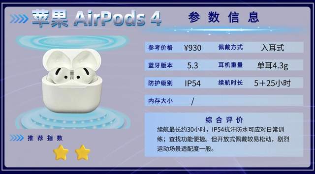 AirPods 4轻巧便携、使用便利,主动降噪和IP54防护适合日常通勤和轻运动。音质中规中矩,佩戴舒适,但运动稳定性一般,低频不算出彩。整体来看,它更适合日常使用和轻度运动,追求专业运动或极限运动的人可能需要考虑其他选择。