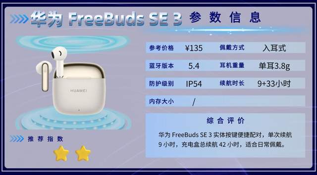 FreeBuds SE 3适合日常佩戴、通勤、轻松听歌,续航长(耳机单次9小时,配合充电盒总续航42小时),操作方便。但运动适合度有限,不适合剧烈运动或长时间跑动,佩戴稳固性和舒适度稍欠。