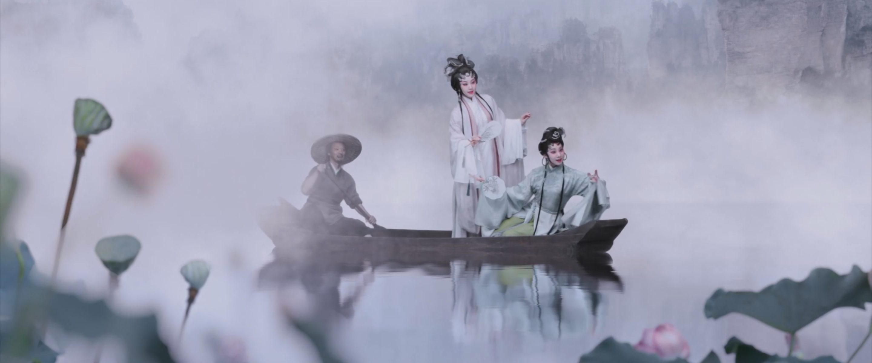 流动的气韵让画面产生一种空灵美,也能营造出特定的情绪氛围。烟水朦胧,雾气氤氲,采莲女登场,合唱《蓝蓝天,水涟涟》。画面与唱词高度匹配,看的时候,恍若置身于汉代乐府诗《江南》的意境:“江南可采莲,莲叶何田田。鱼戏莲叶间……”腴润的莲瓣,绰约的花姿,让我不禁想到南宋的画作《出水芙蓉图》。湖水、远山、竹林、庭院,这种流动的气韵无处不在,借以渲染喜悦、愤怒、哀愁、欢乐、悲伤、恐惧、惊惶等各种情绪。