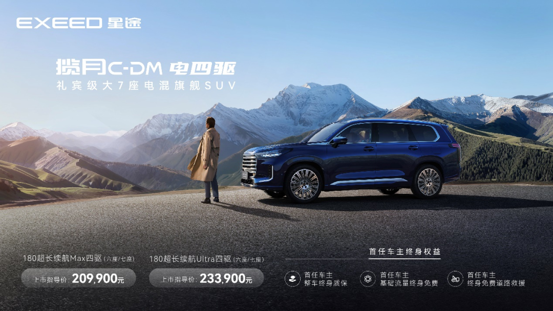 此次,星途旗舰车型礼宾级大7座电混旗舰SUV——星途揽月C-DM共推出180超长续航Max四驱、180超长续航Ultra四驱两个版本,均配有2+2+2的6座、2+3+2的7座可选。官方指导价为20.99万元-23.39万元。