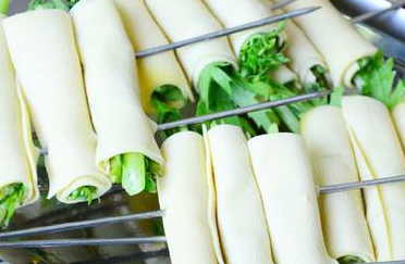 第三名的豆腐香菜卷,一小张的豆腐皮,里面卷上少许的洋葱,和香菜,卷成卷,一串上面大概是四个或者五个,放在烧烤架上烤制,白色的干豆腐皮慢慢变干,然后涮酱翻面撒上作料,发甜的洋葱,夹带着香菜的香气,再配上豆腐的口感,简直就是人间美味!