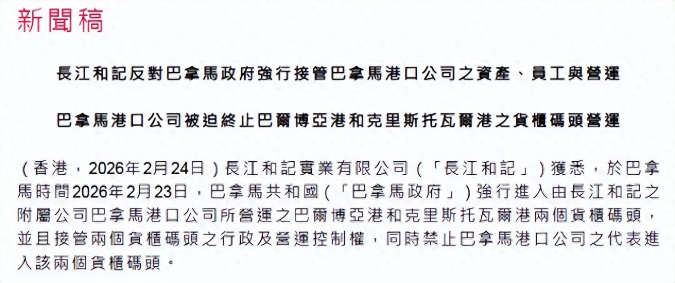 2月24日,李嘉诚家族名下的长和集团发布通报,确认巴拿马法院在判定集团子公司运营的两座港口违宪后,已派人进驻码头并强行接管了行政及运营控制权,同时禁止长和旗下公司的代表进入两个货柜码头。