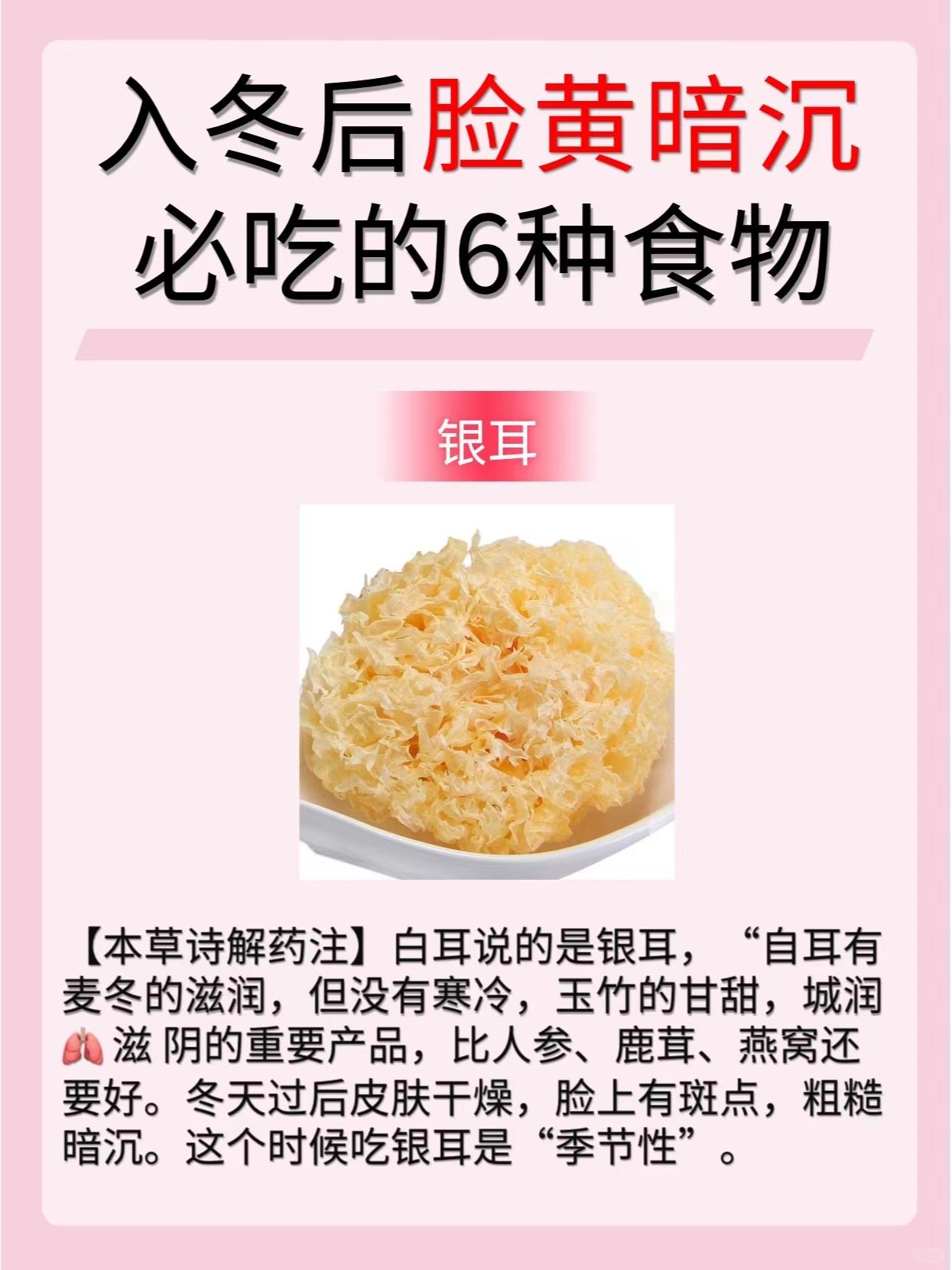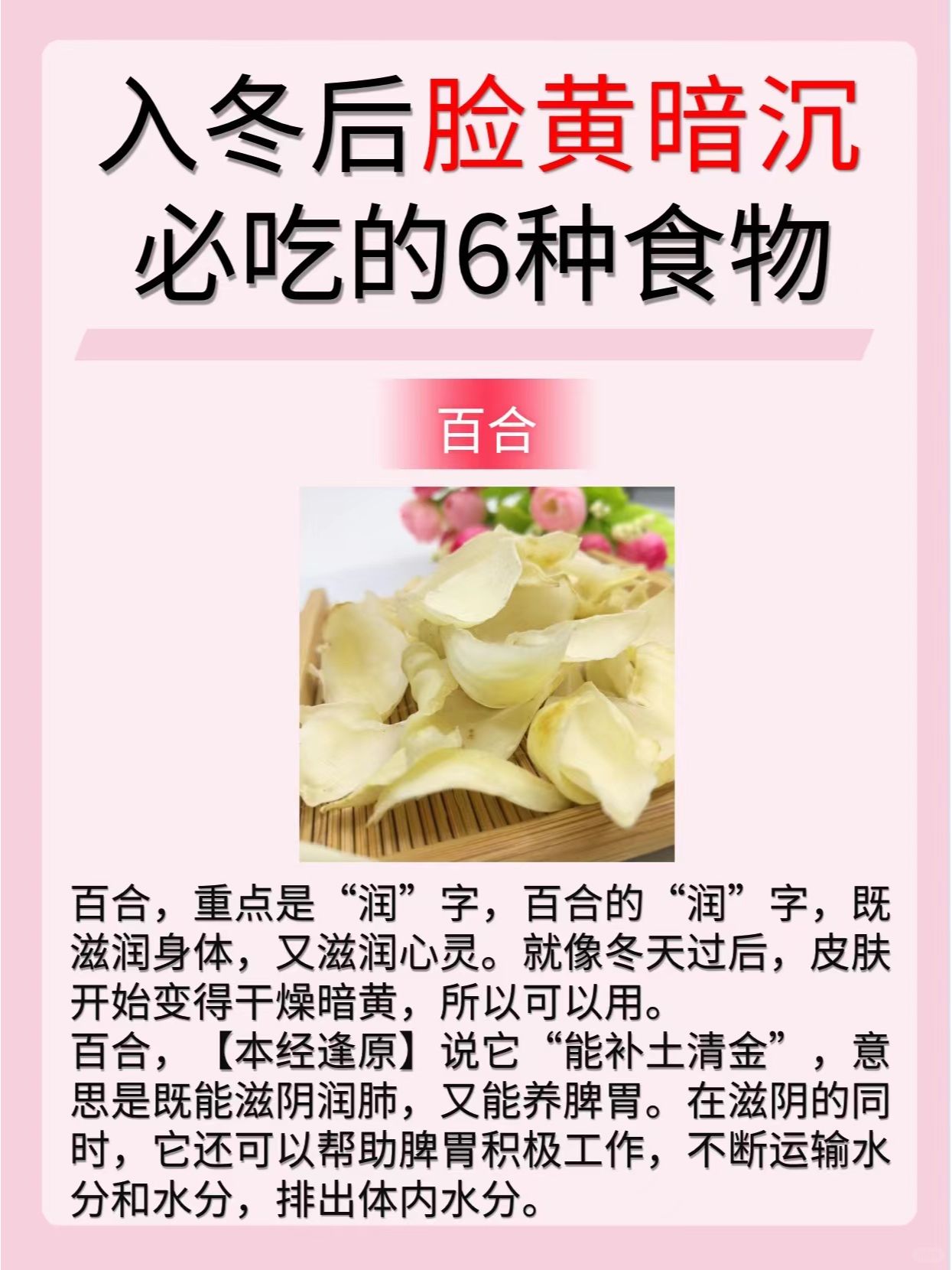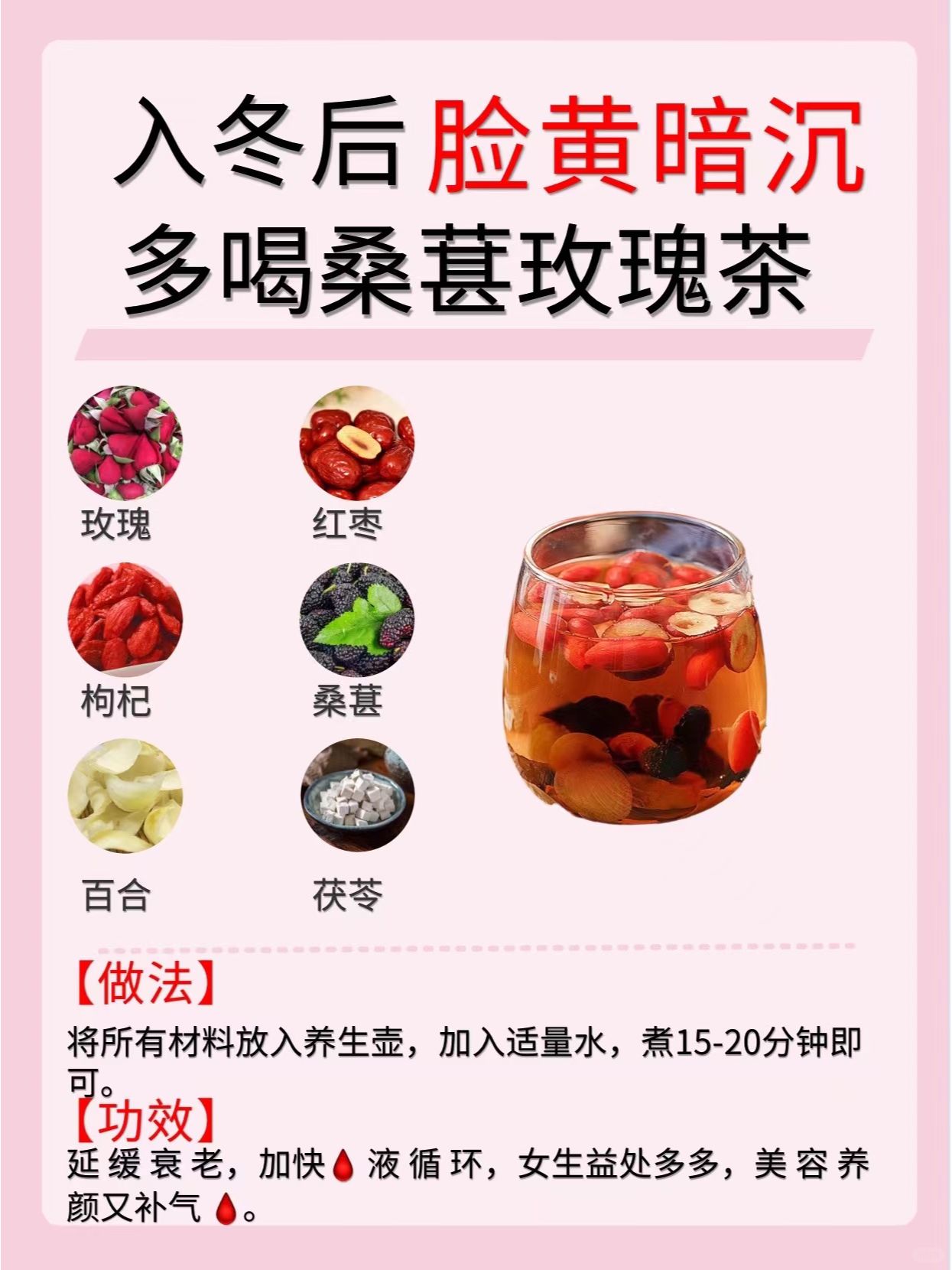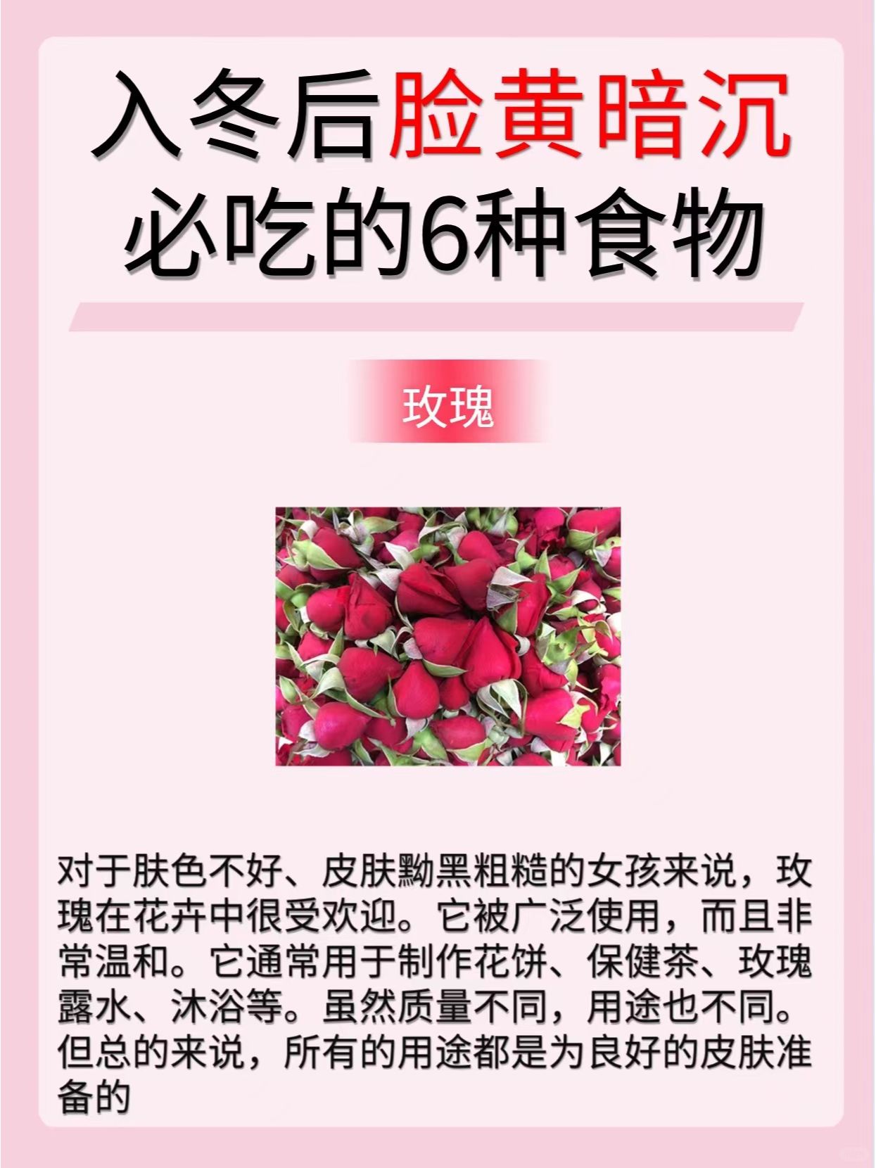 1️⃣玫瑰 2️⃣红枣 3️⃣茯苓 4️⃣百合 5️⃣银耳 6️⃣桑葚 🌸今天的分享就到这里了,希望大家喜欢🌸 持续关🐷我,每天分享更多养生小知识哦~