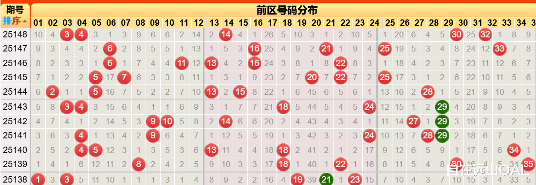 前区热点区域:号码02、04、08、09、13、14、18、21、27、29、35等构成了一个高频出现集群。尤其是01-15的小号区及27-35的大号区,持续保持高热状态。